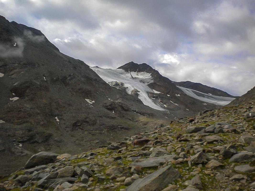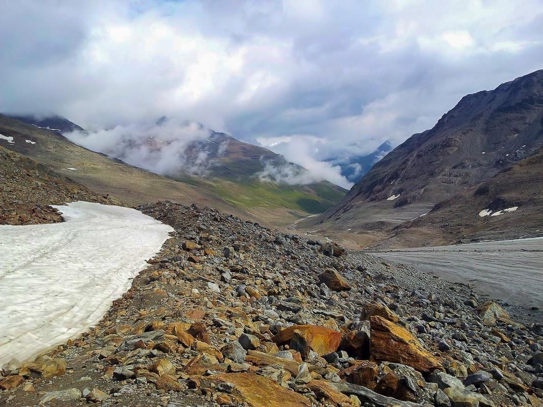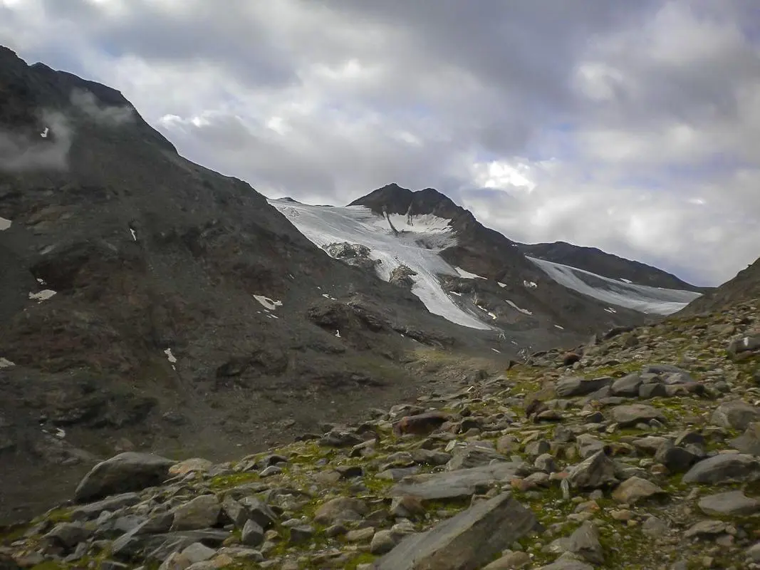 Berglandschaft mit Gletscher und steiniger Untergrund unter bewölktem Himmel