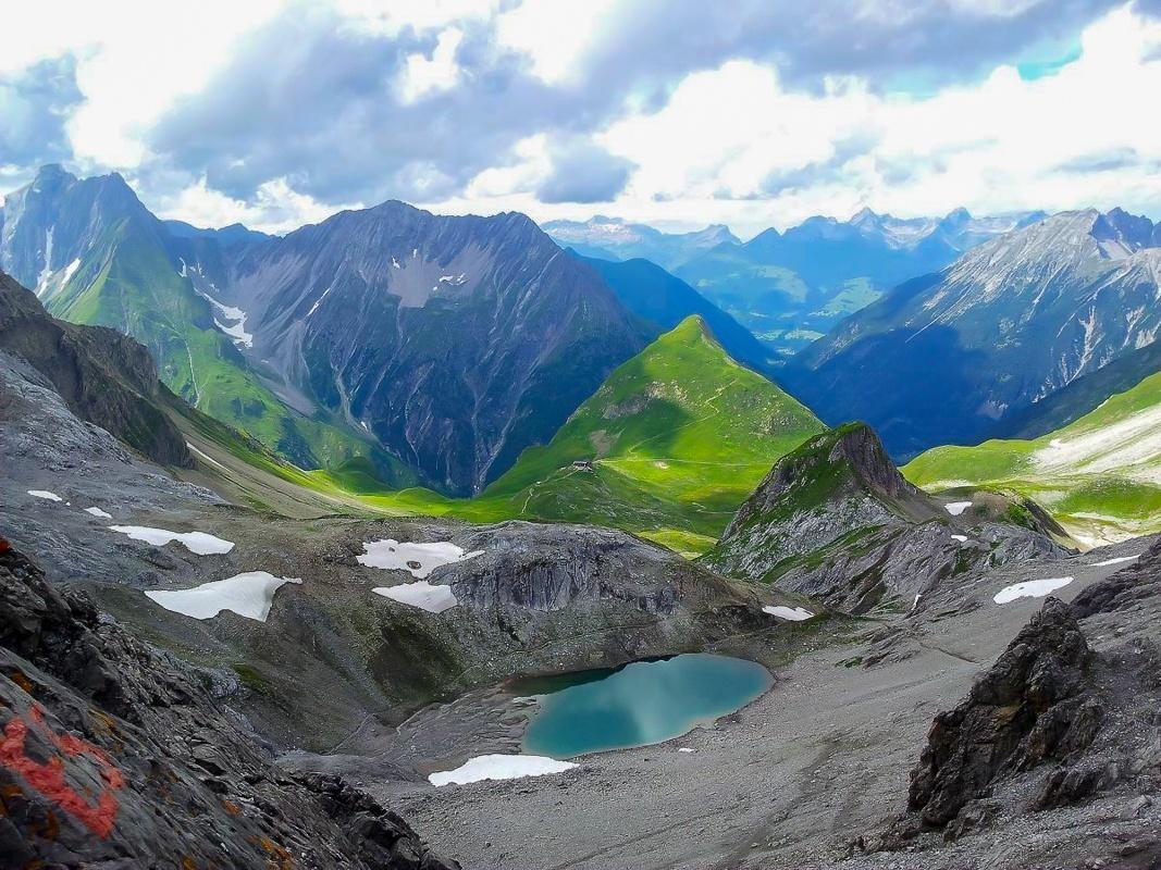 Berglandschaft mit grünen Hängen, schneebedeckten Gipfeln und einem kleinen See im Tal