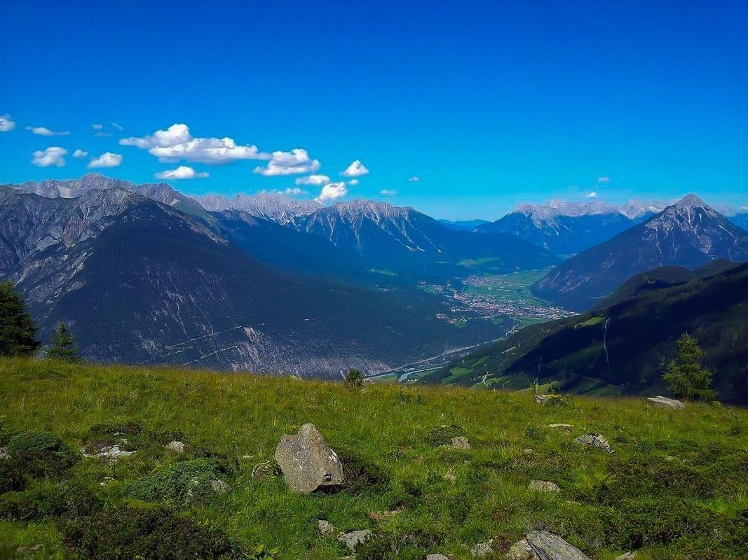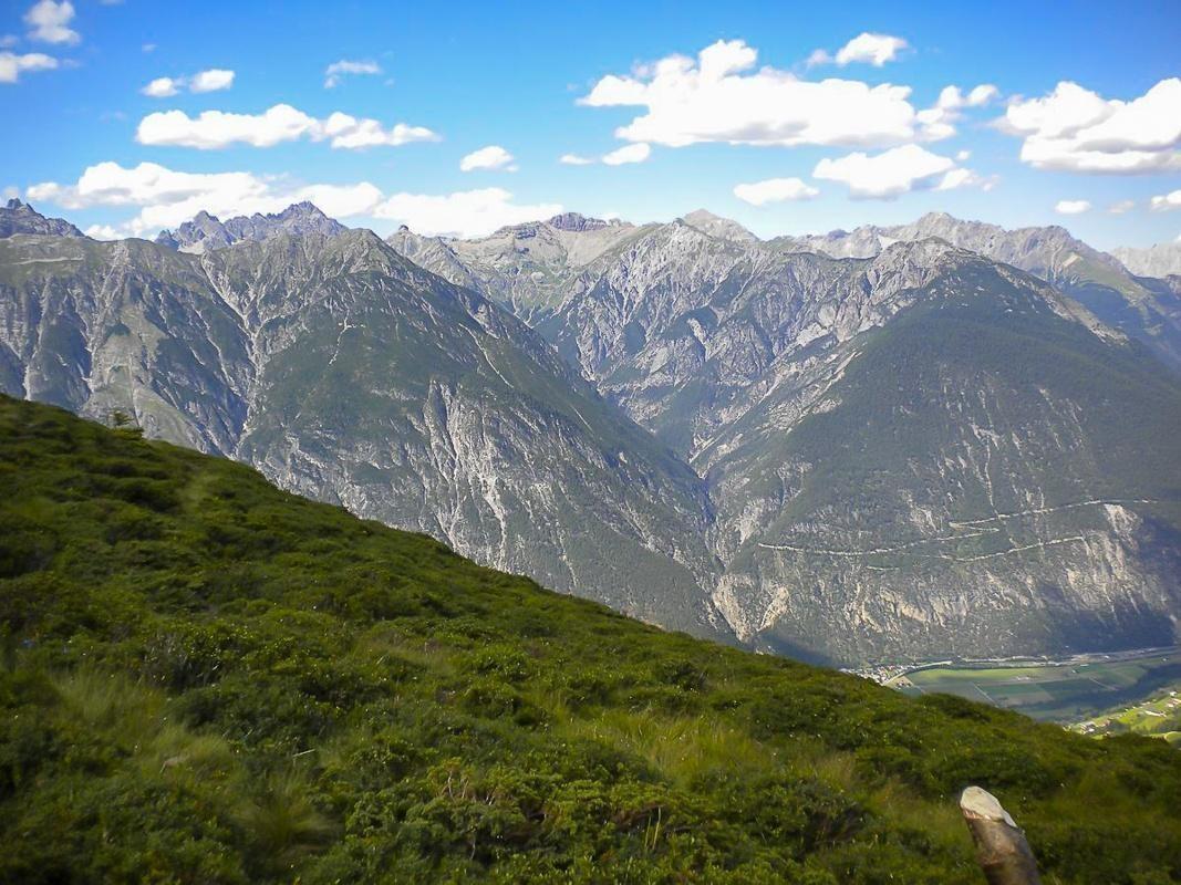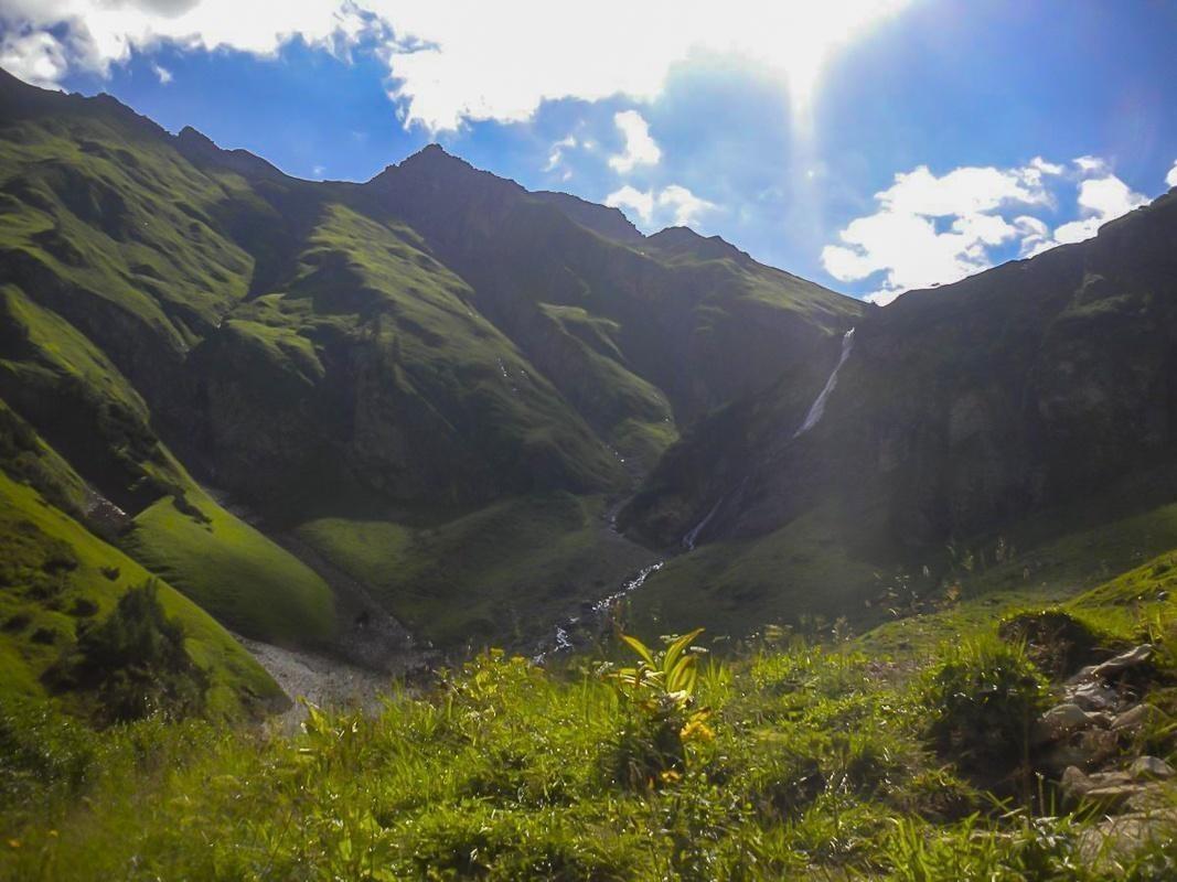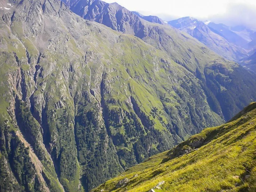 Blick auf eine grüne Berglandschaft mit steilen Hängen und einem Tal