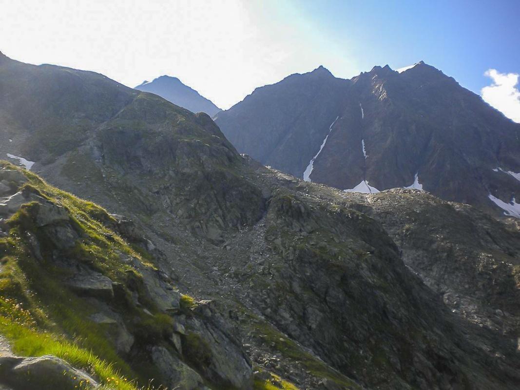 Berglandschaft mit steilen Felsen und grünen Hängen im Hintergrund