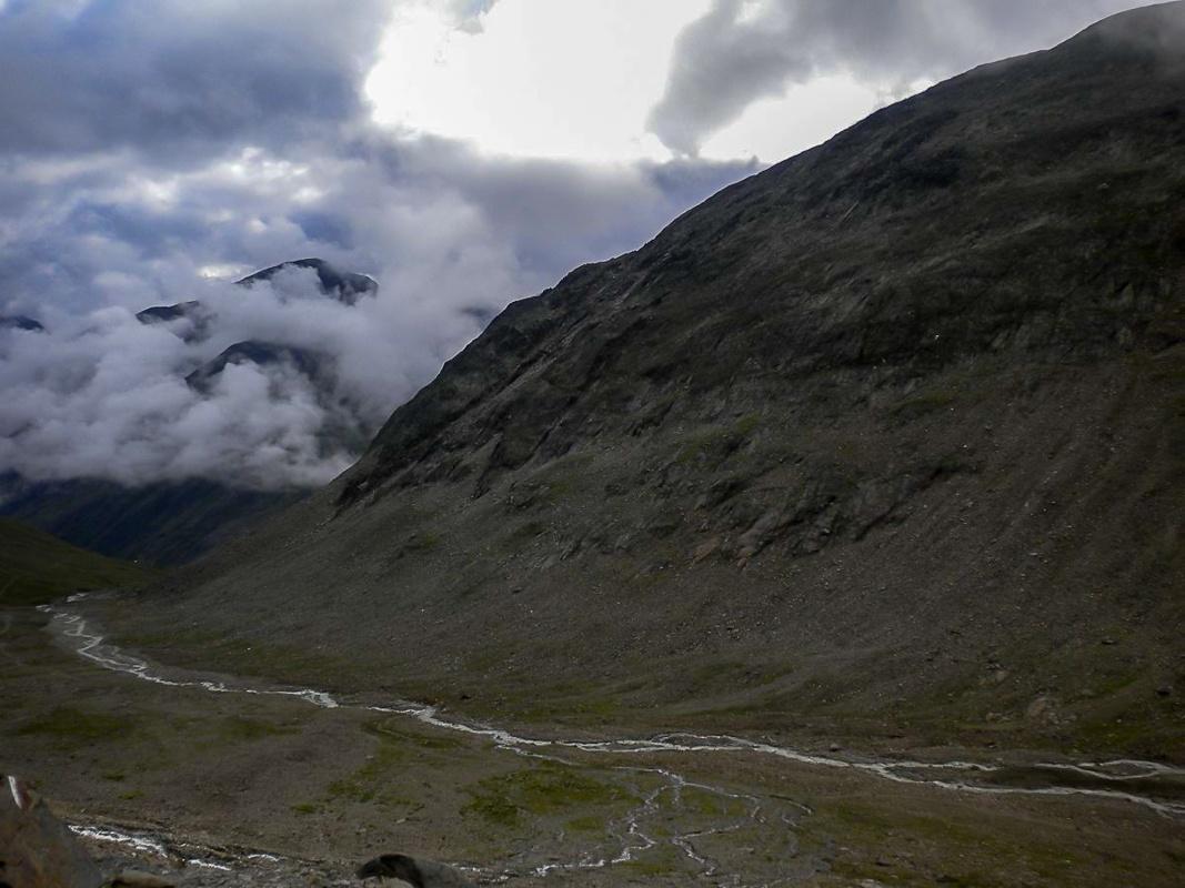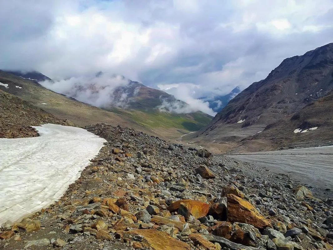 Schneebedeckte Fläche und steiniger Hang in einem Gebirgstal mit Wolken