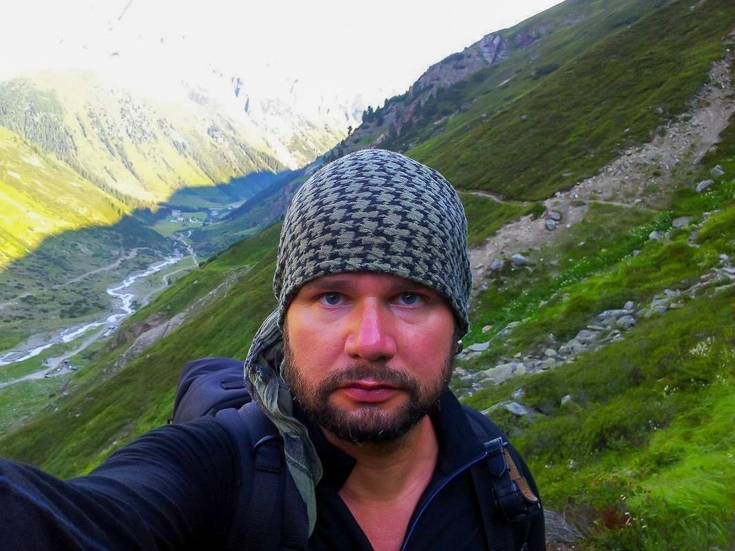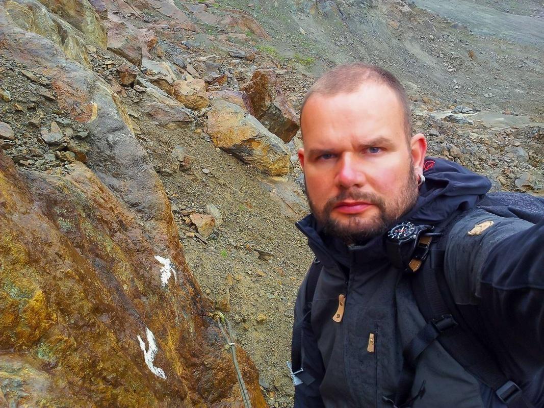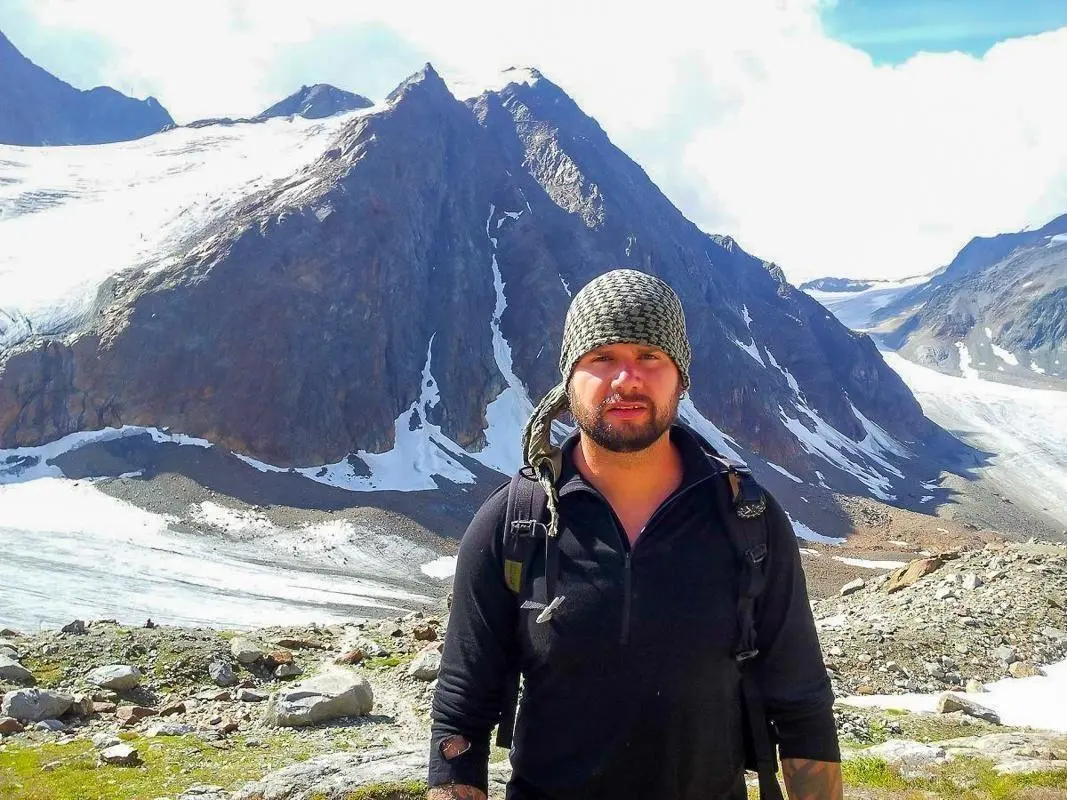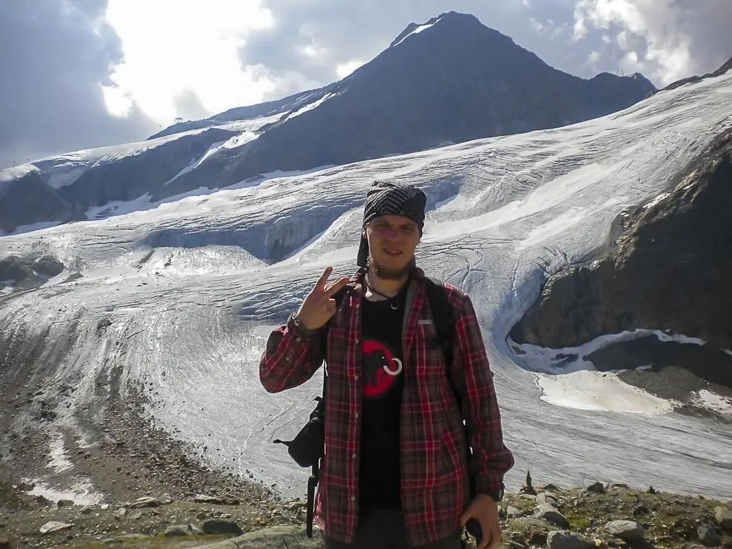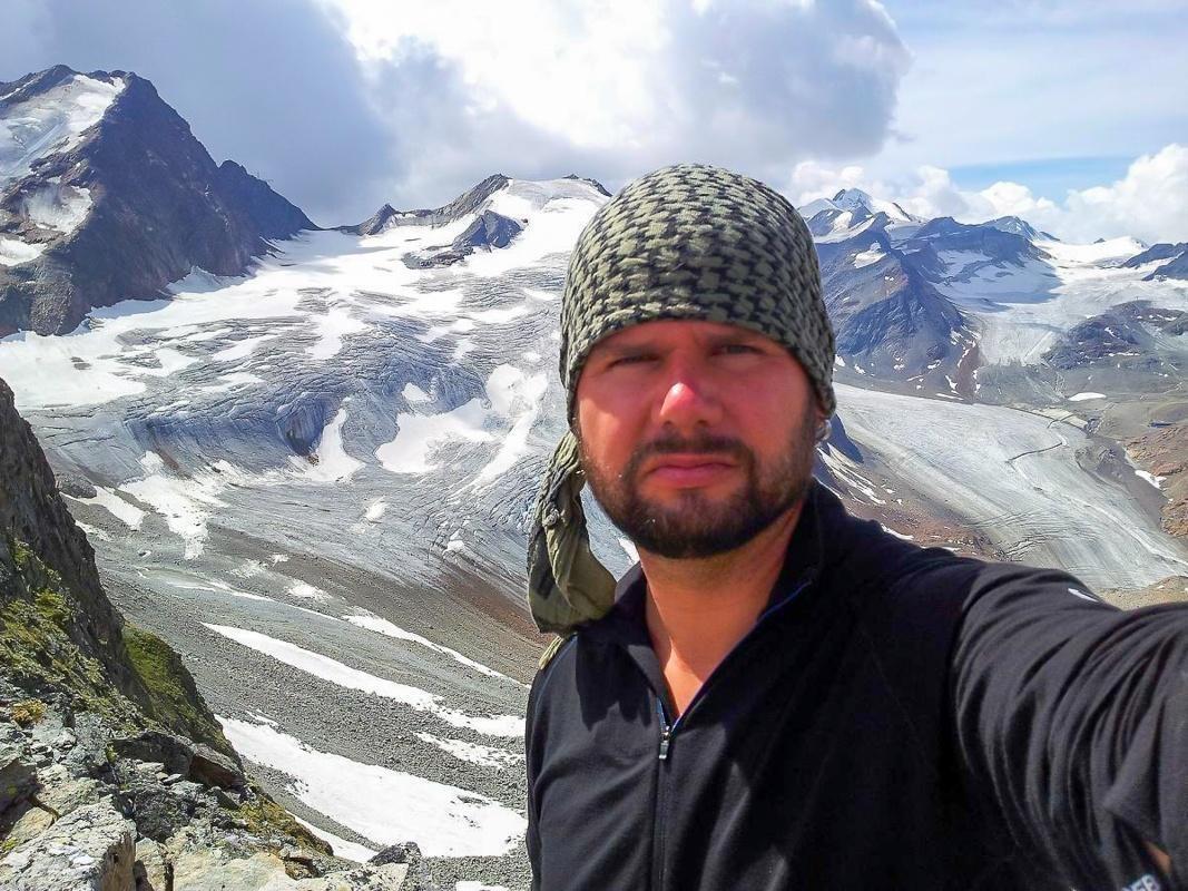 Selbstporträt vor einer beeindruckenden Berglandschaft mit Gletschern und Felsen