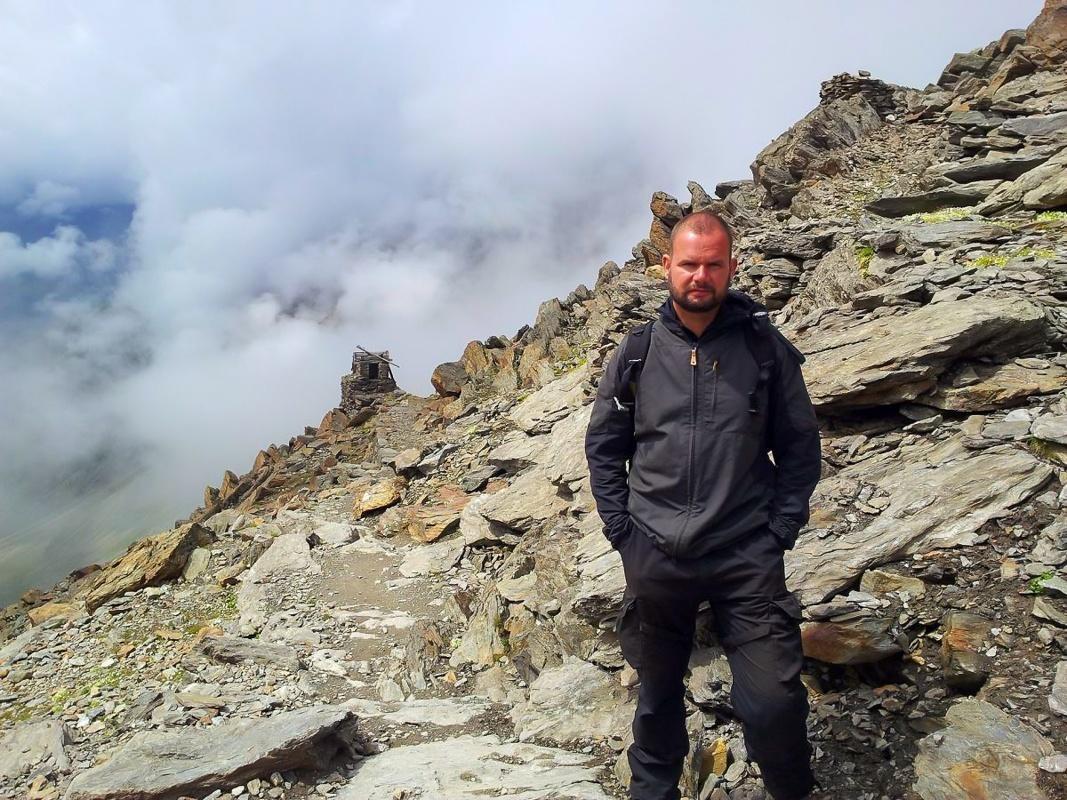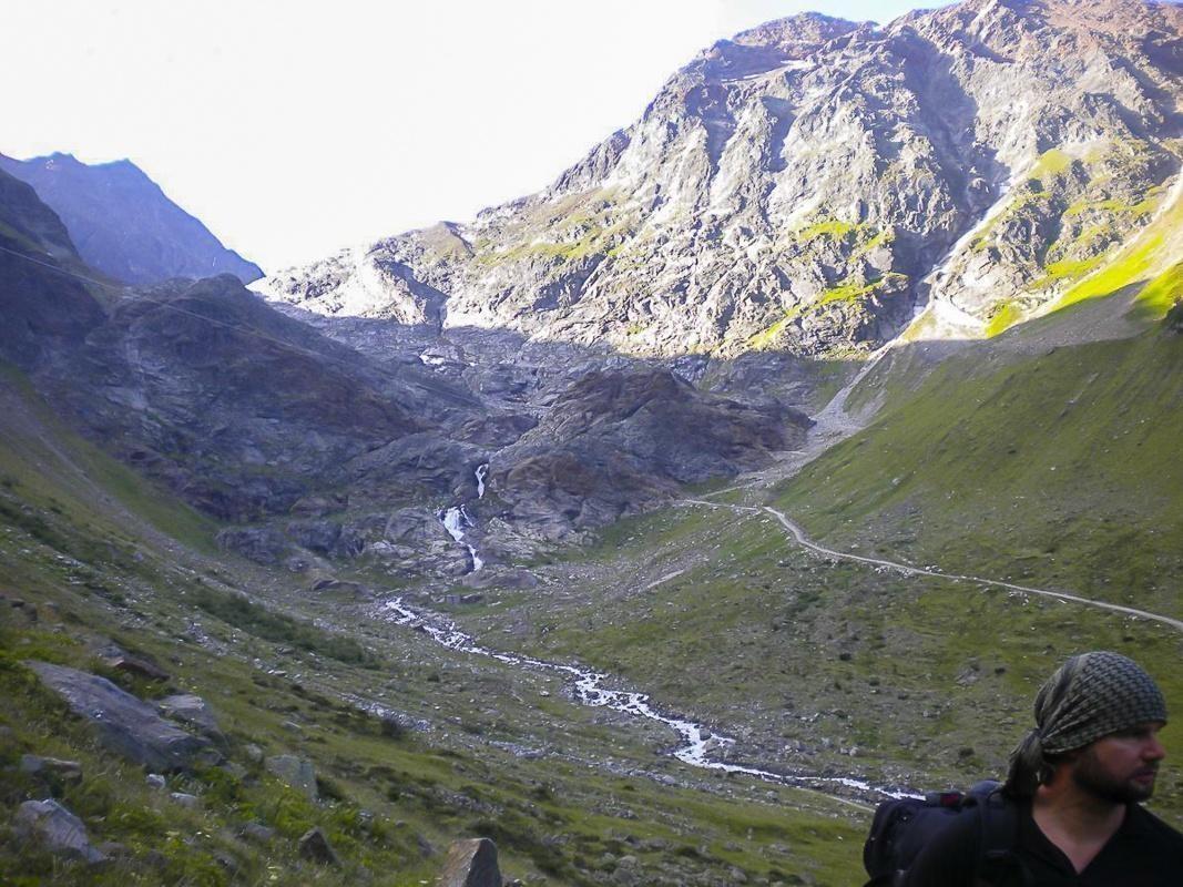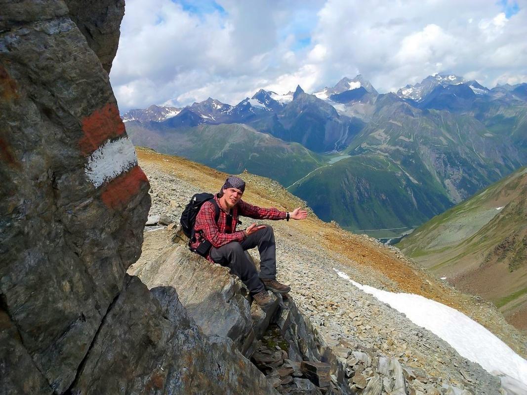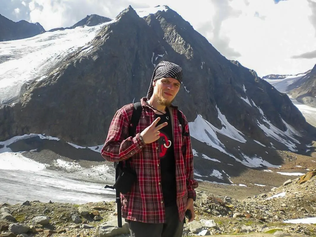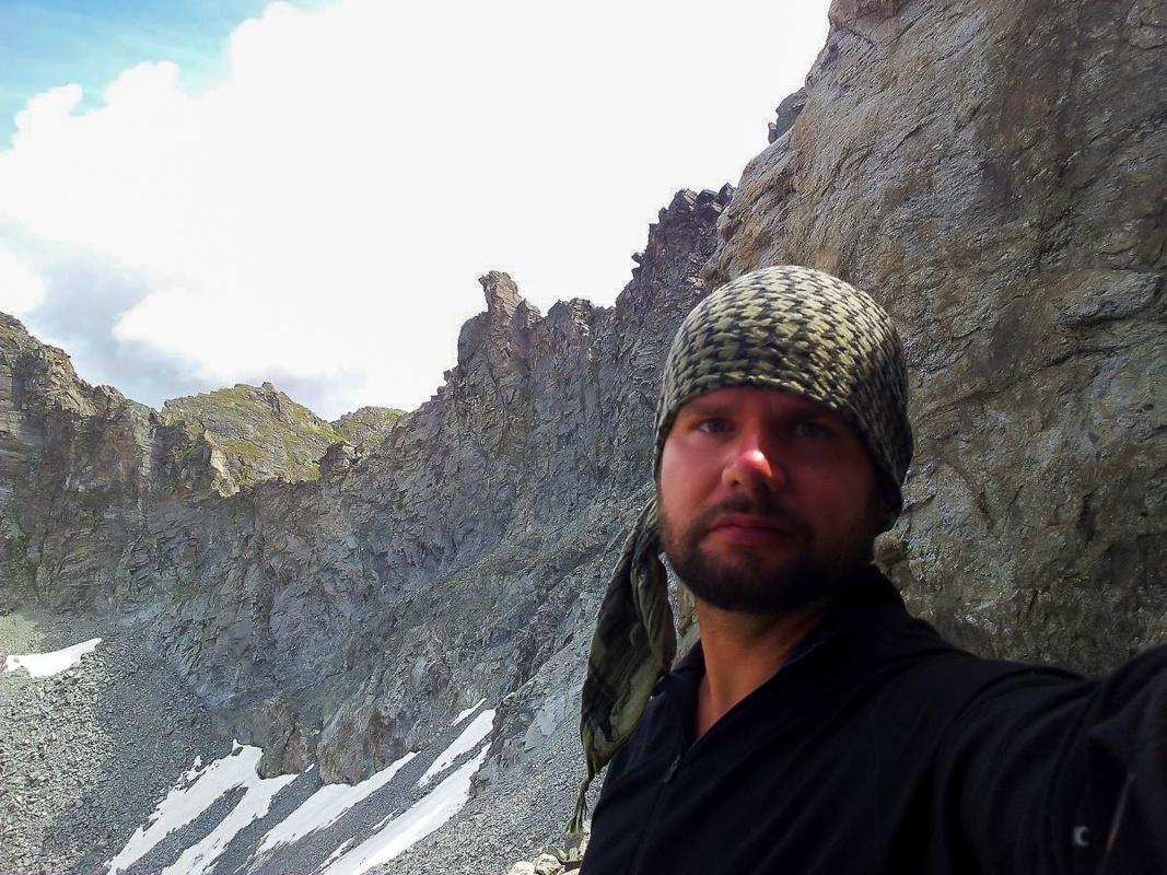 Selbstporträt vor einer beeindruckenden Berglandschaft mit Gletschern und Felsen