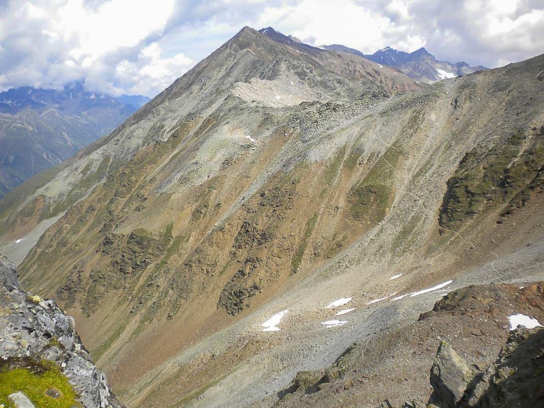 Berglandschaft mit steilen Hängen und felsigen Gipfeln unter bewölktem Himmel