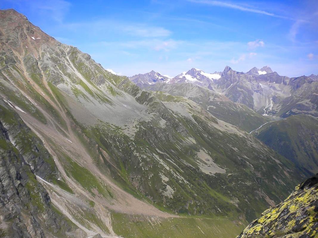 Berglandschaft mit steilen Hängen und schneebedeckten Gipfeln im Hintergrund