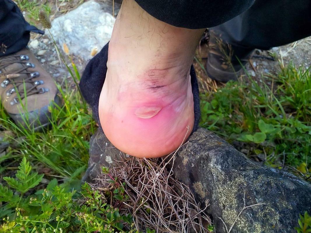 Blasenbildung an der Ferse eines Fußes, umgeben von Gras und Steinen