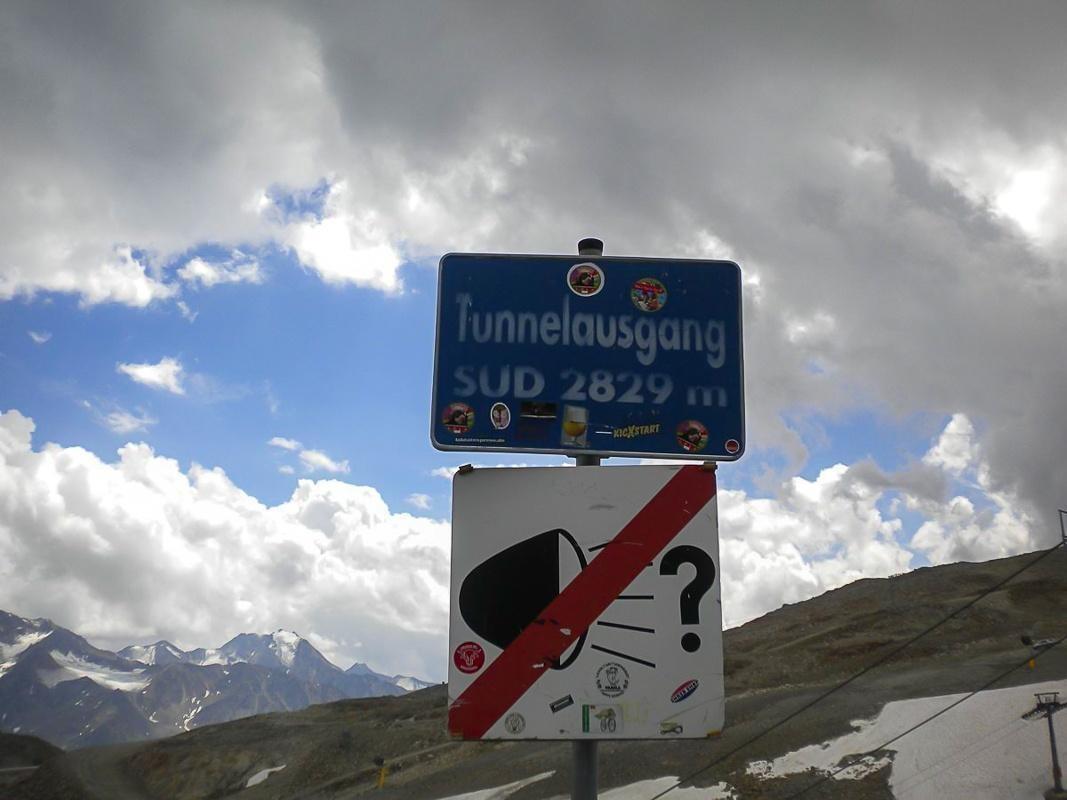 Blaues Schild mit der Aufschrift „Tunnelausgang Süd 2829 m“ und Symbolen