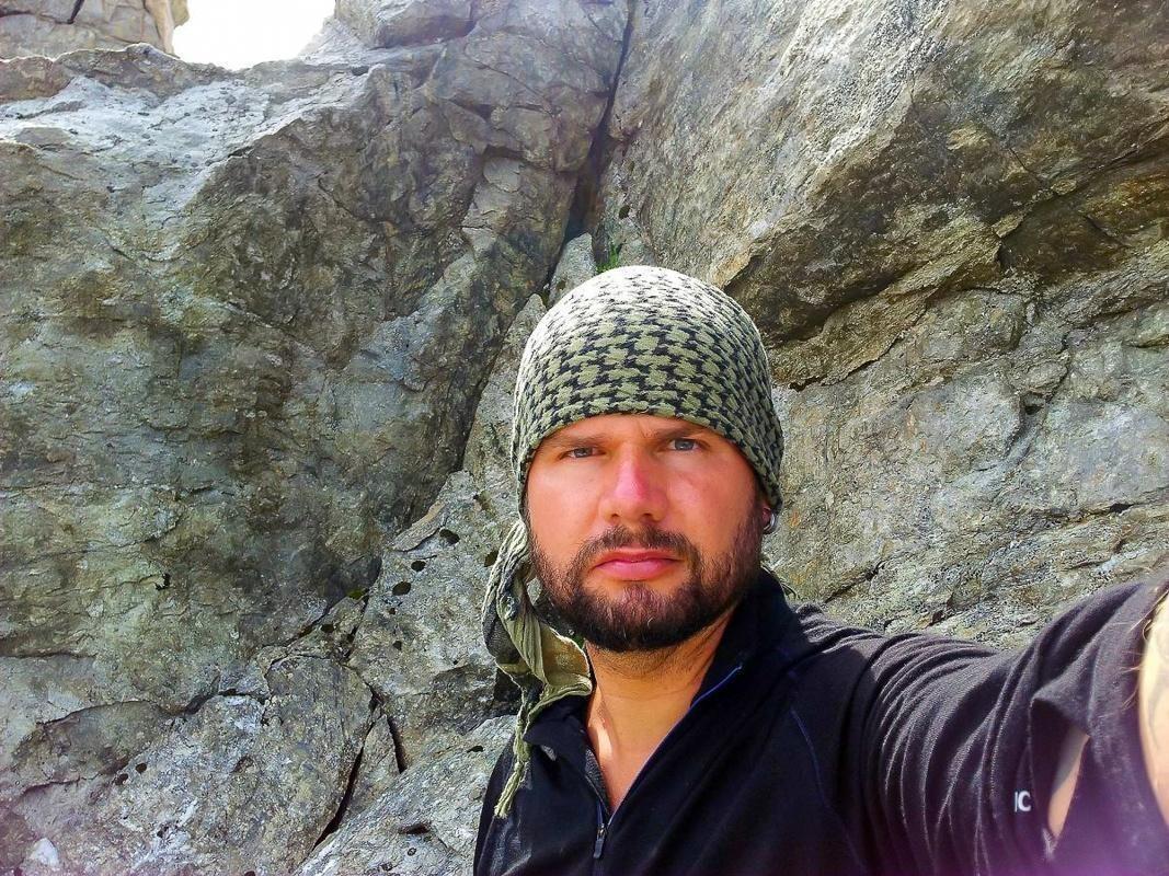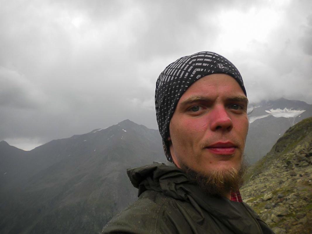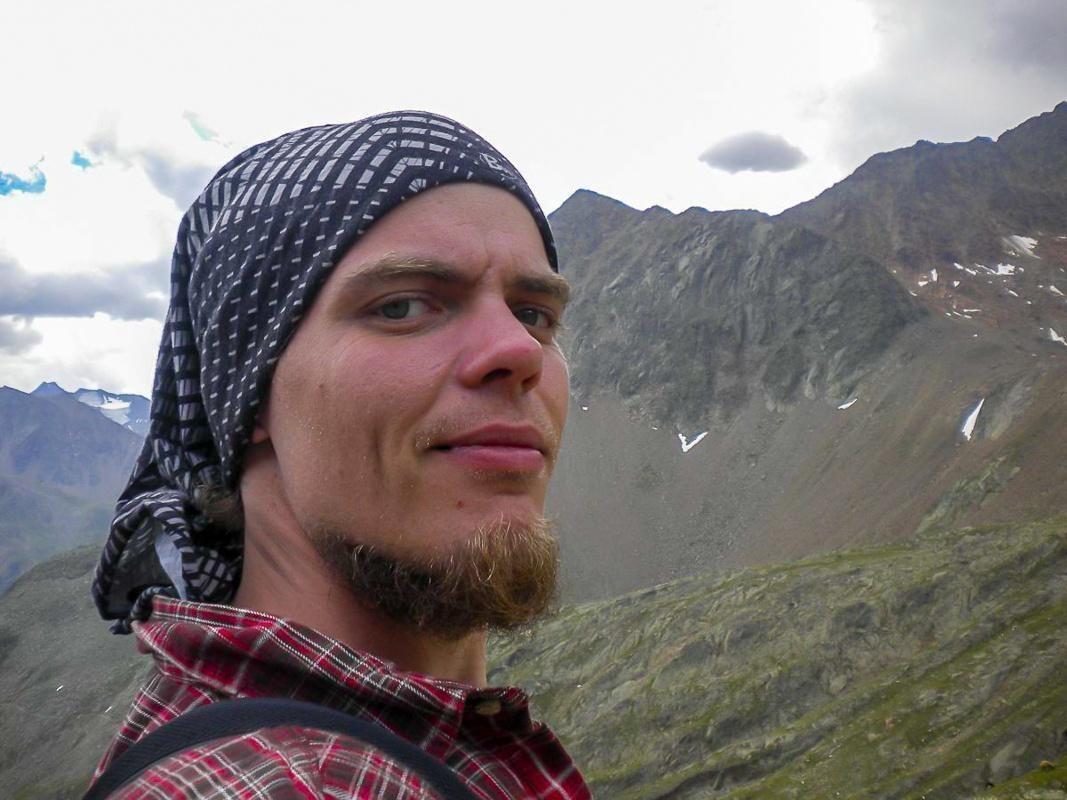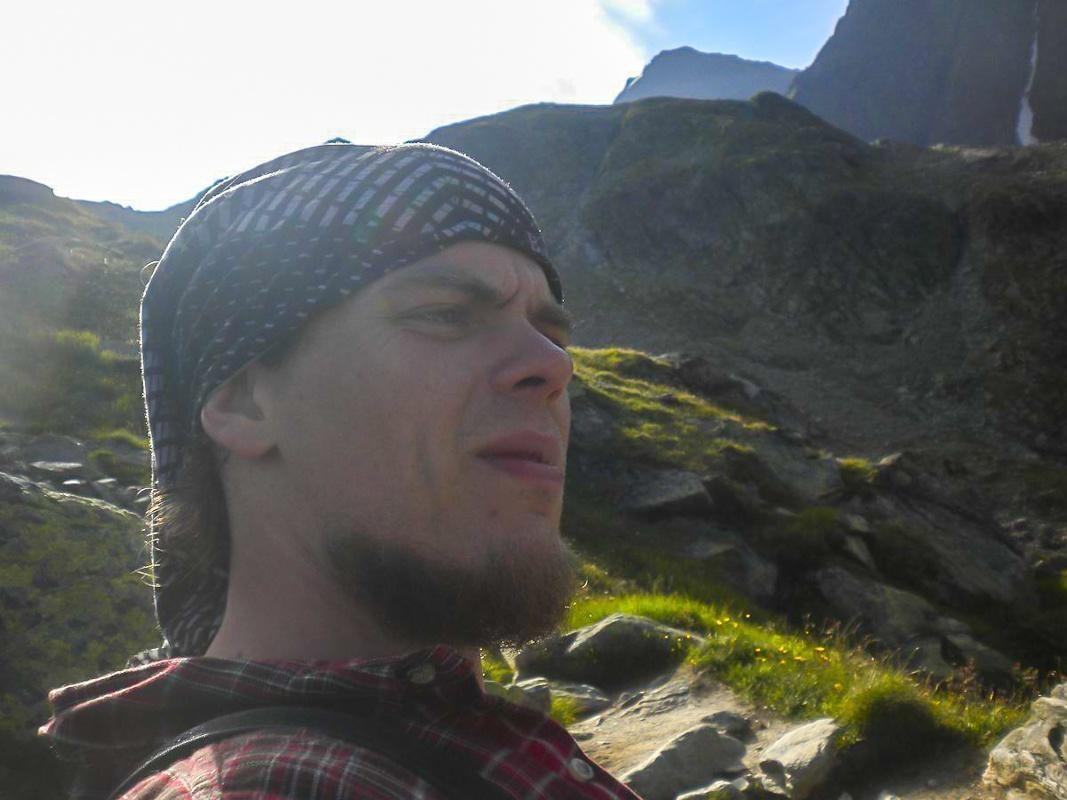 Selbstporträt in bergiger Landschaft mit Rucksack und Kopfbedeckung