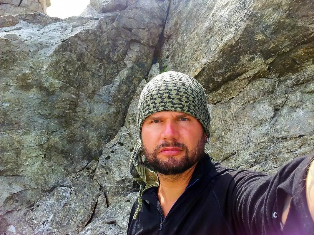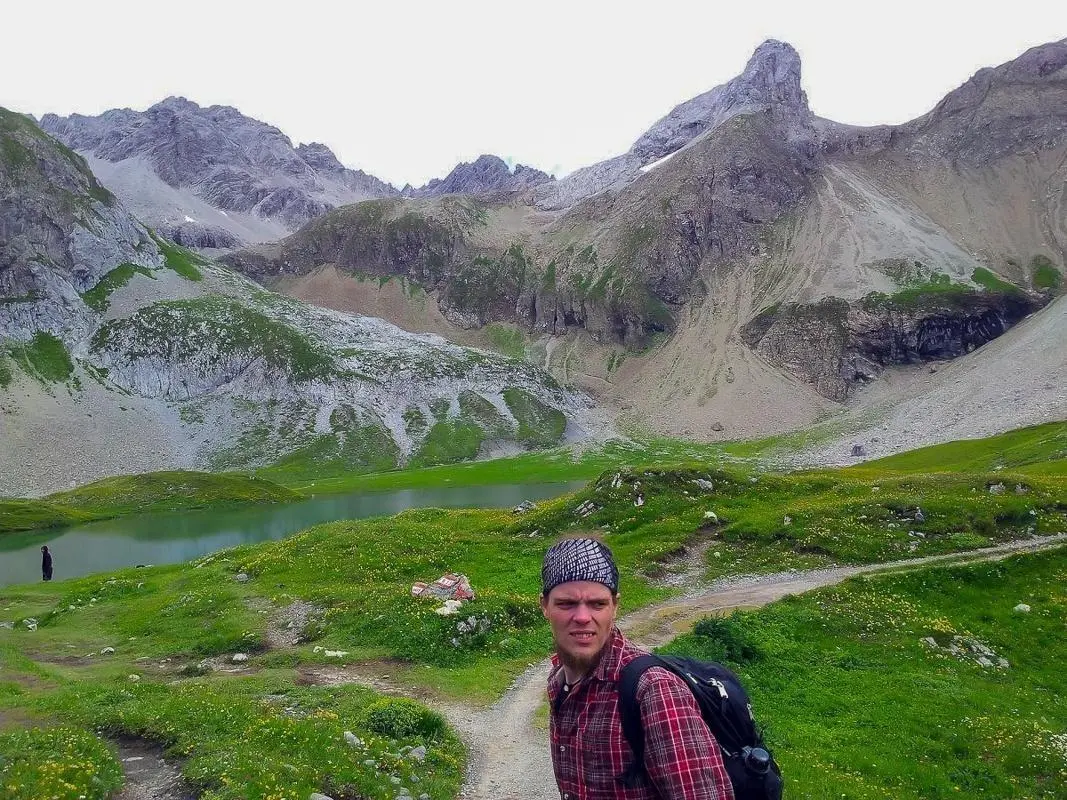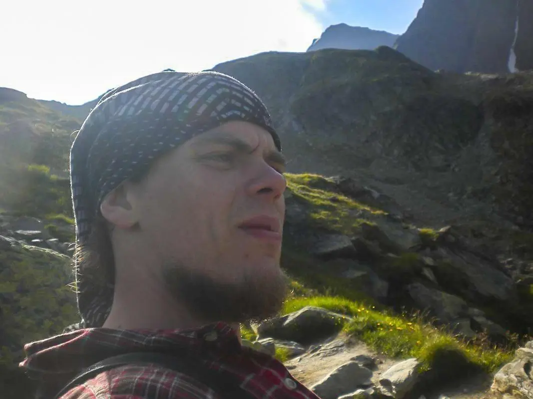 Ein Mann mit Kopftuch und kariertem Hemd steht vor einer Berglandschaft
