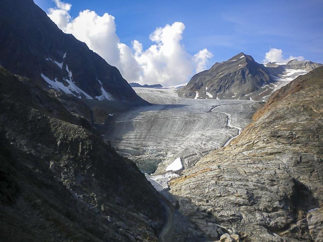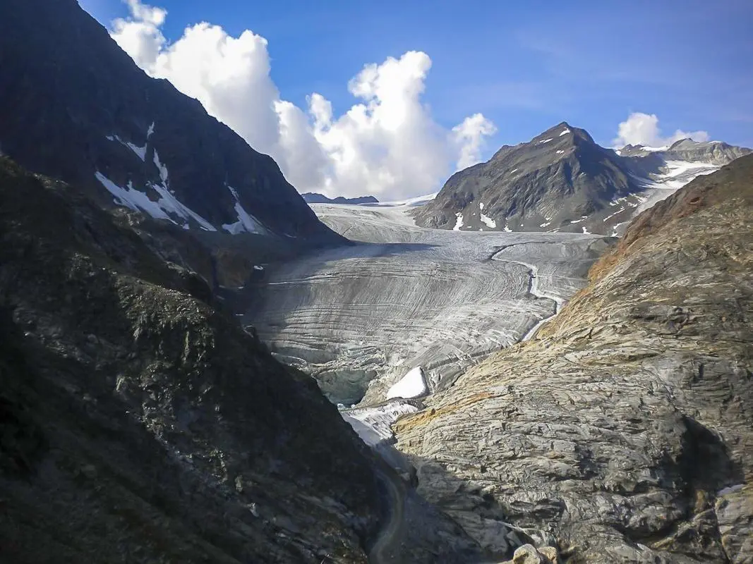 Gletscher zwischen steilen Felswänden und schneebedeckten Gipfeln in den Alpen