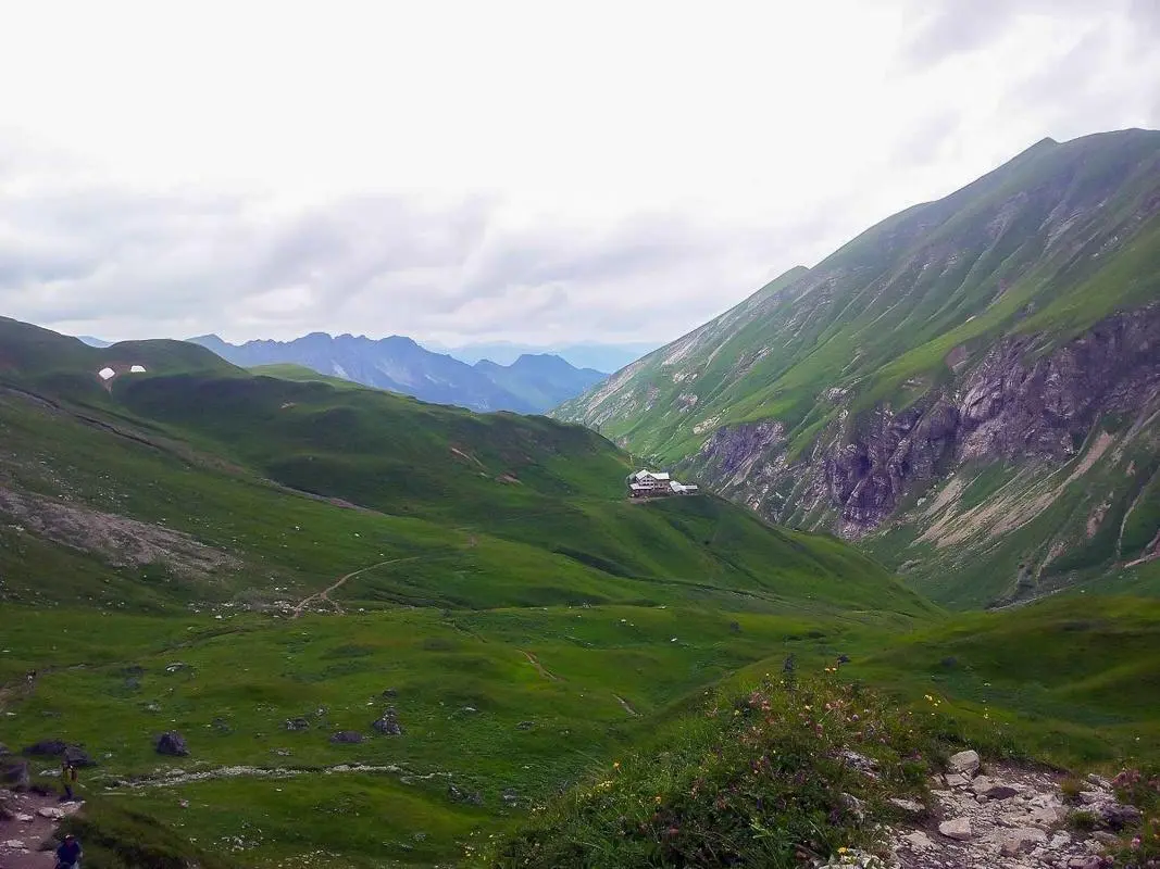 Berglandschaft mit grünen Wiesen und einer Berghütte im Vordergrund