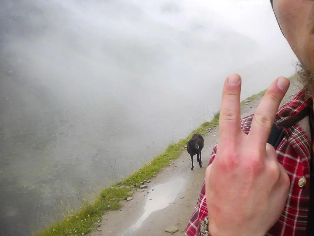 Hand zeigt Peace-Zeichen, im Hintergrund steht ein schwarzes Tier auf einem Weg