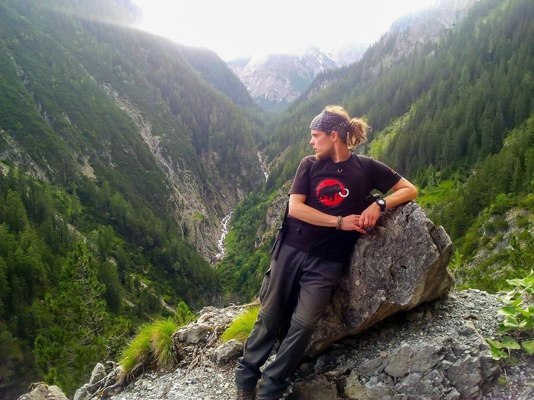 Mann lehnt an einem großen Stein und blickt ins Tal mit Bäumen und Bergen
