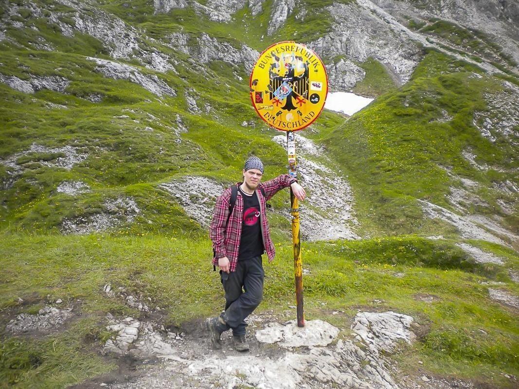 Mann zeigt auf ein Schild mit dem Schriftzug „Bundesrepublik Deutschland“ in einer Berglandschaft