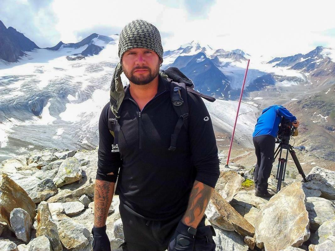 Mann steht auf einem Berggipfel, im Hintergrund schneebedeckte Berge und Kameraaufbau