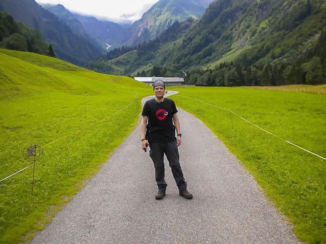 Mann mit Rucksack steht auf einer grünen Wiese vor einer felsigen Berglandschaft