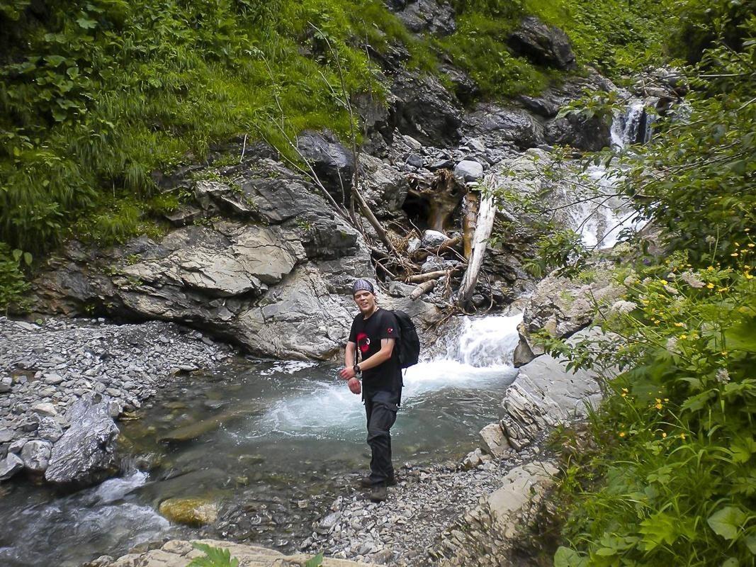 Mann steht im Wasser eines kleinen Baches, umgeben von Felsen und Pflanzen