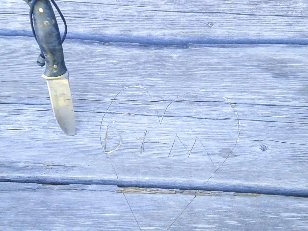 Messer liegt neben einer in Holz eingeritzten Herzform mit Initialen