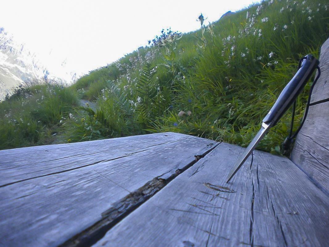 Messer steckt in einer Holzoberfläche, umgeben von Gras und Blumen