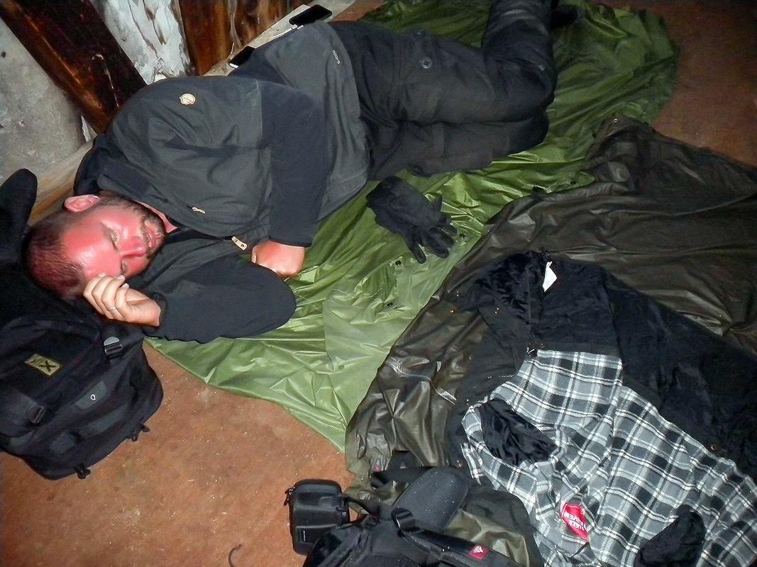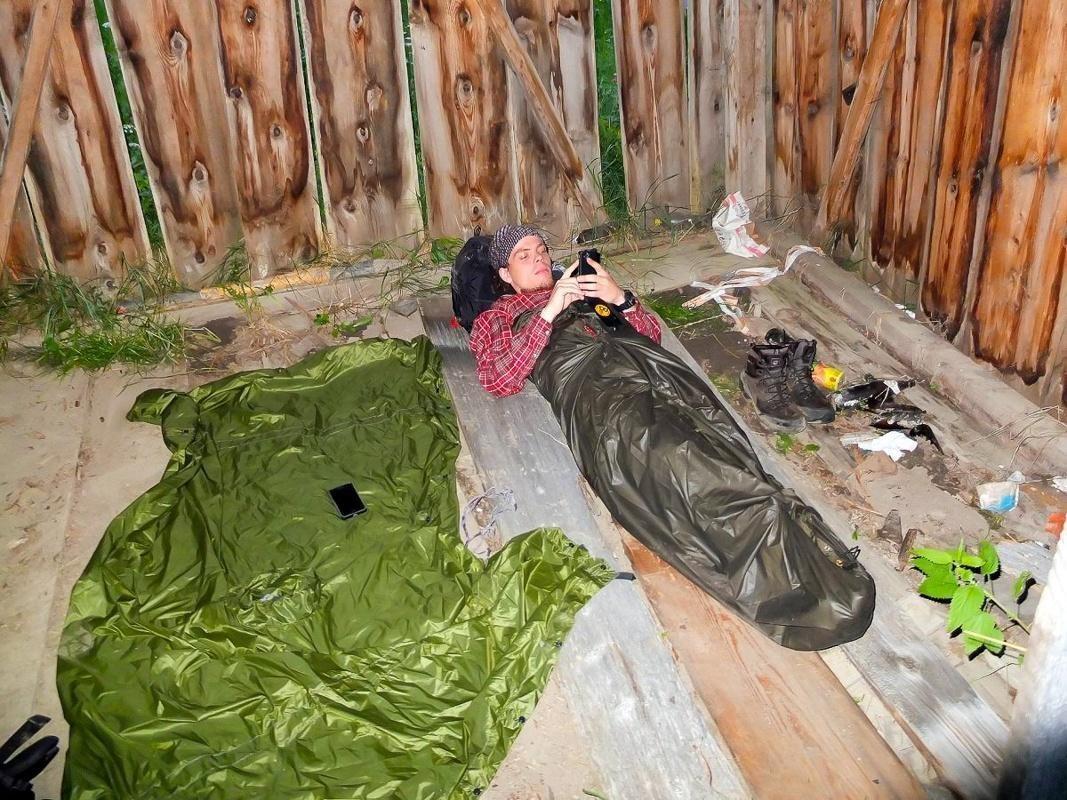 Schlafsack liegt auf Holzplanken, Person nutzt Smartphone in improvisierter Unterkunft