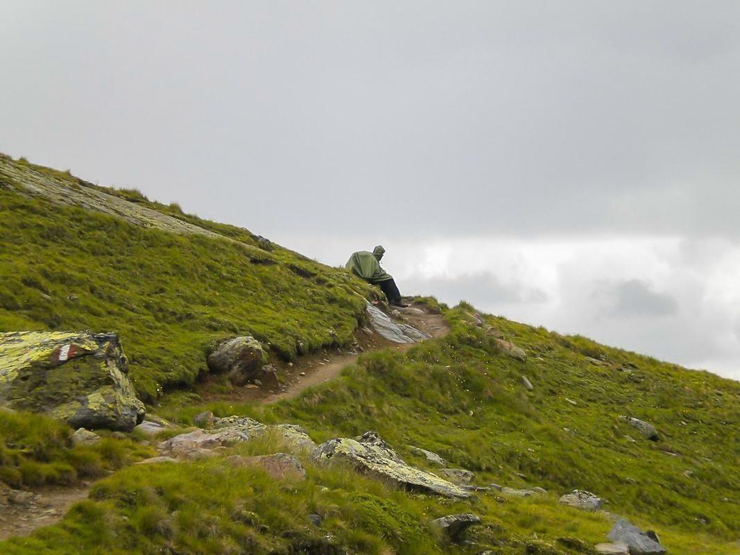 Person sitzt auf einem Hang neben einem Wanderweg, umgeben von Gras und Felsen