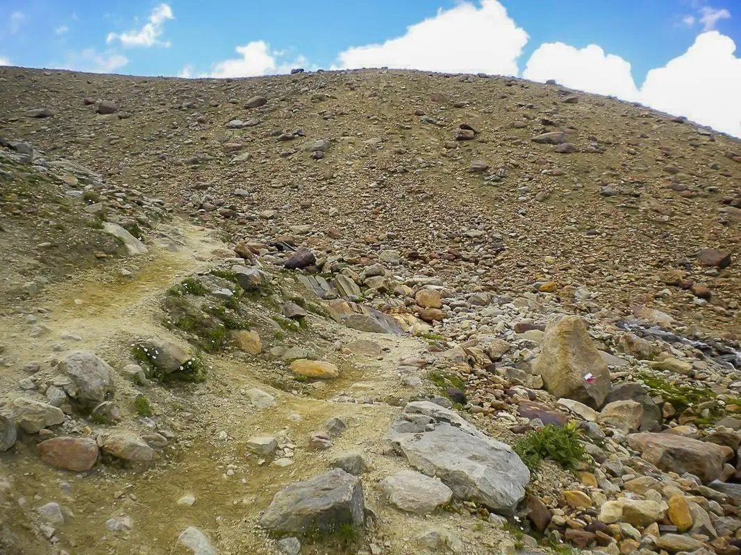 Geröllfeld mit grünem Gras und einem pinken Markierungspunkt auf einem Stein