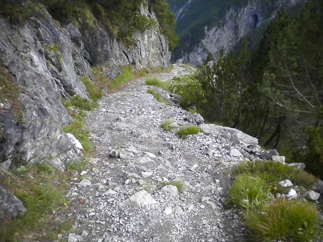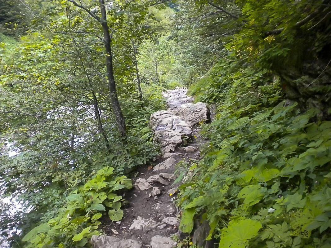 Schmaler, steiniger Pfad entlang einer Felswand mit grünem Bewuchs