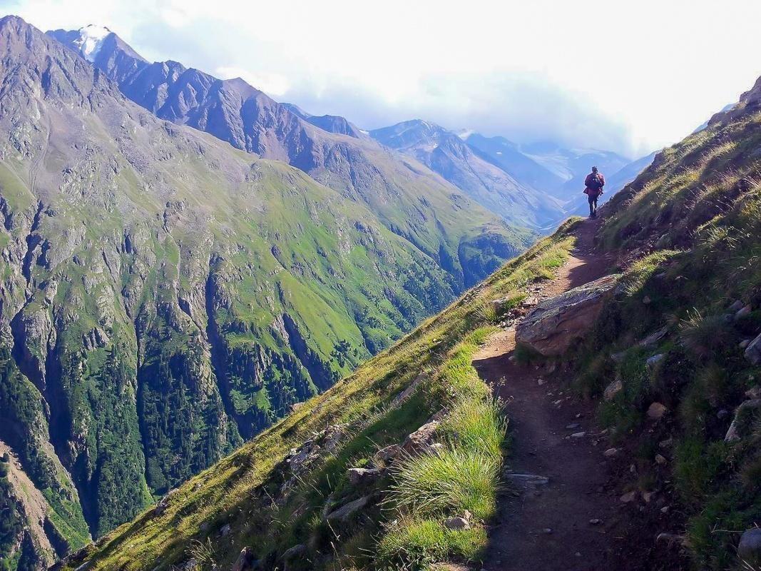 Wanderer auf schmalem Pfad entlang steiler Bergflanke mit grüner Vegetation