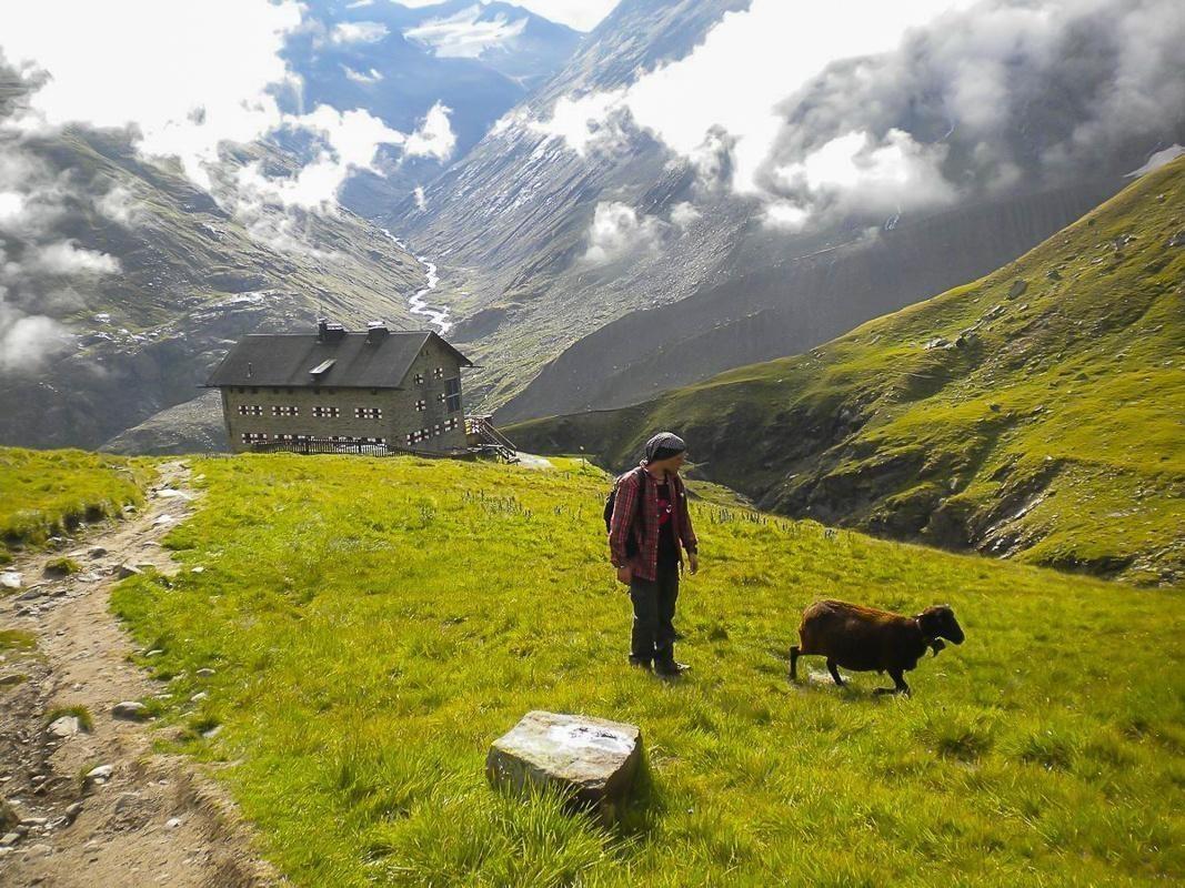 Wanderer steht auf einer Wiese neben einem Schaf, im Hintergrund eine Berghütte