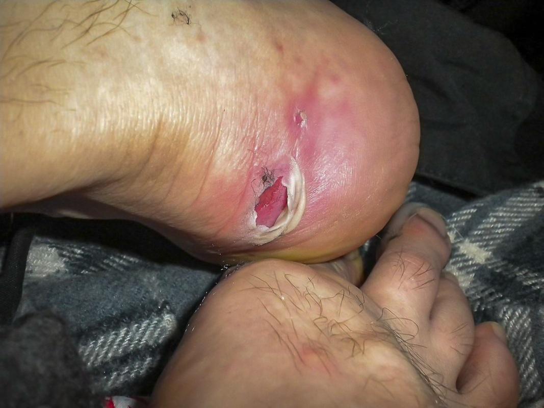 Wunde am Fuß mit Rötung und Blasenbildung, umgeben von Haaren