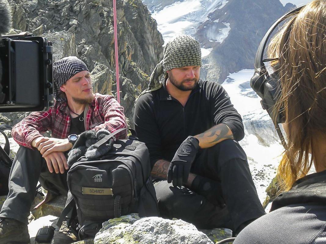 Zwei Personen sitzen auf Felsen, eine Kamera ist auf sie gerichtet