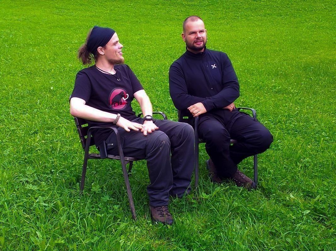 Zwei Personen sitzen auf Klappstühlen auf einer grünen Wiese