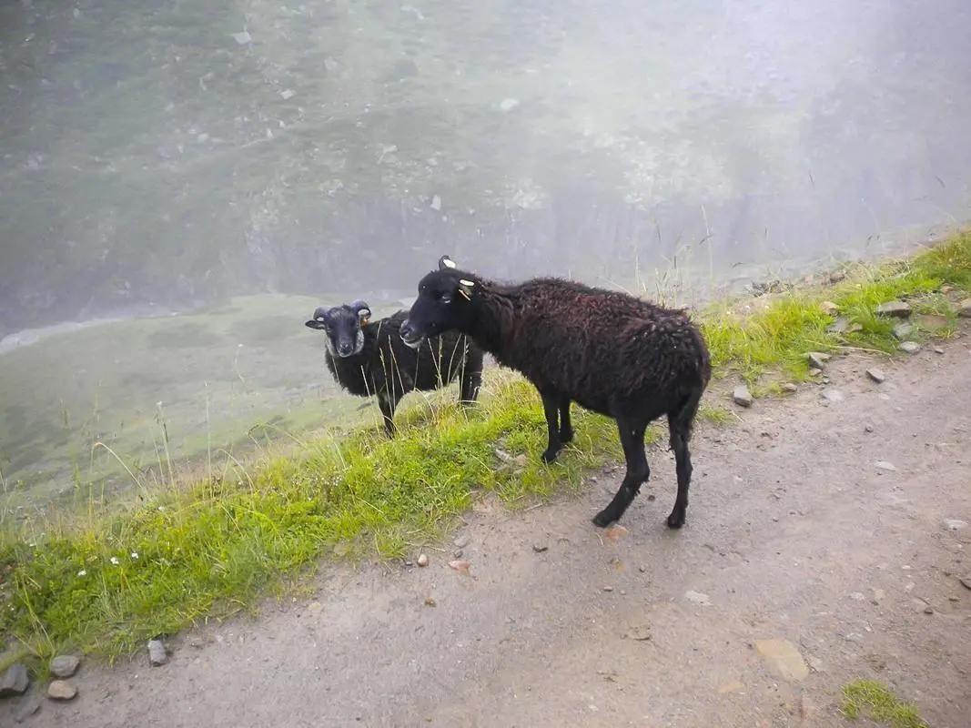 Zwei schwarze Schafe stehen am Wegesrand auf einer grünen Wiese