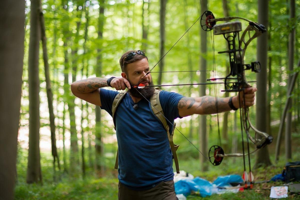 Bogen wird im Wald gespannt, Pfeile sind bereit zum Abschuss
