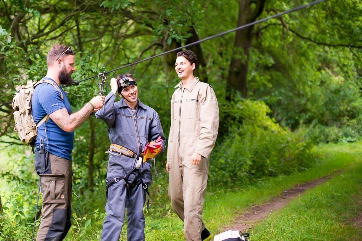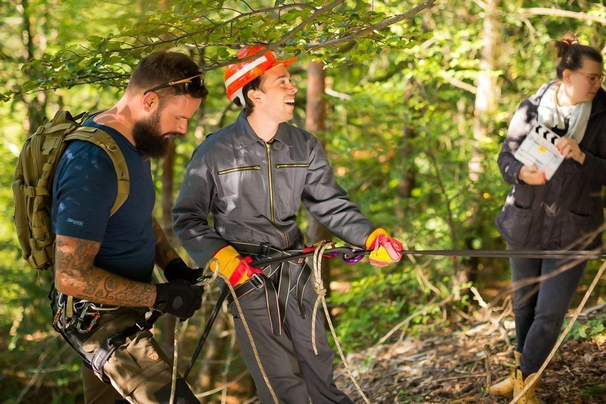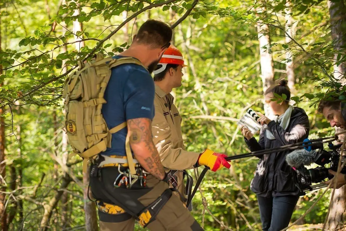 Drei Personen in Waldumgebung, eine Person hält Kamera, andere tragen Sicherheitsausrüstung