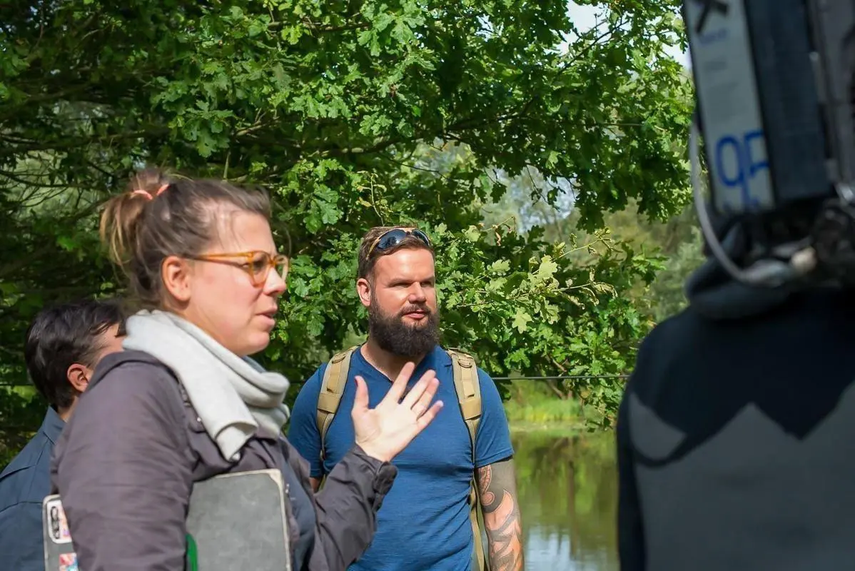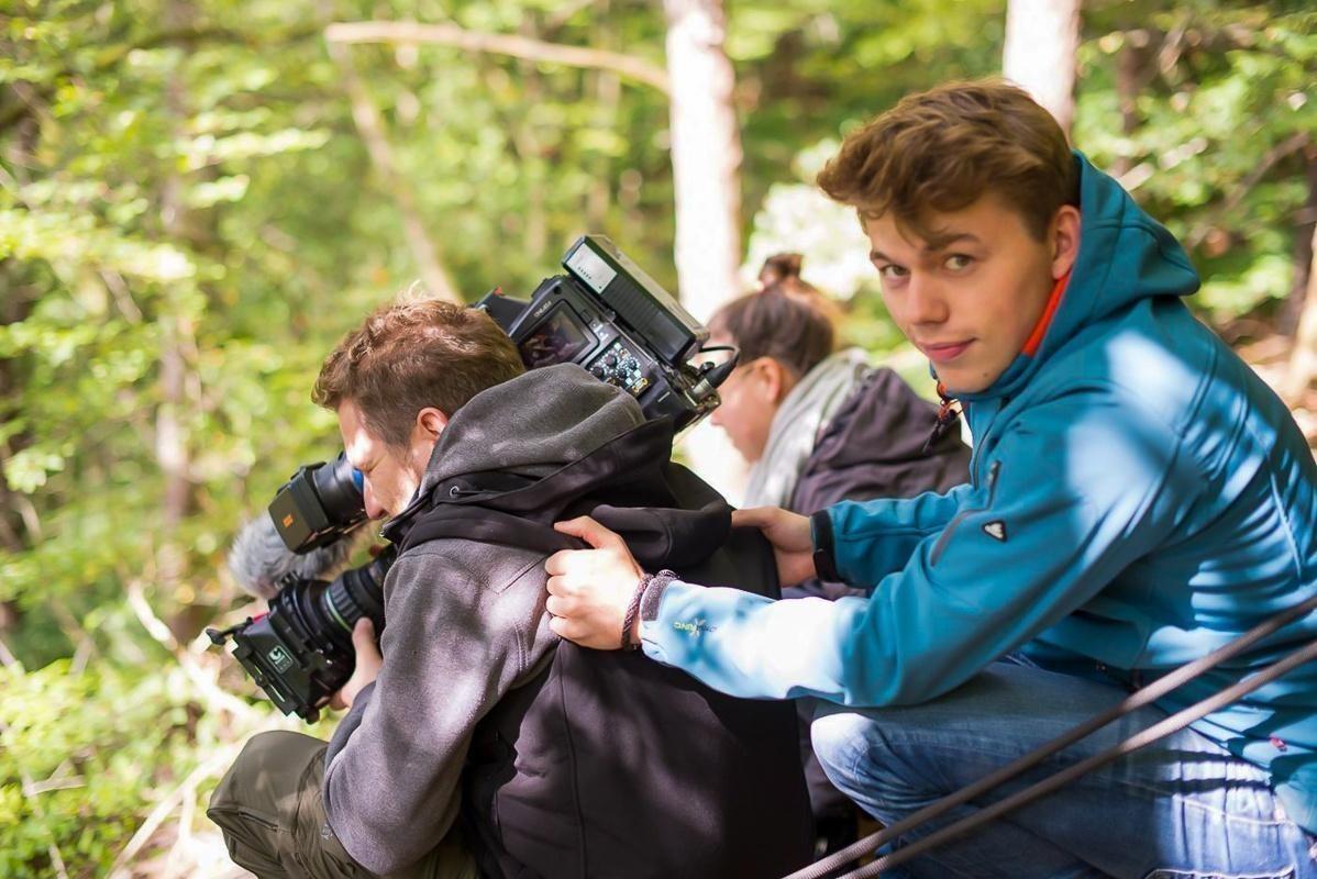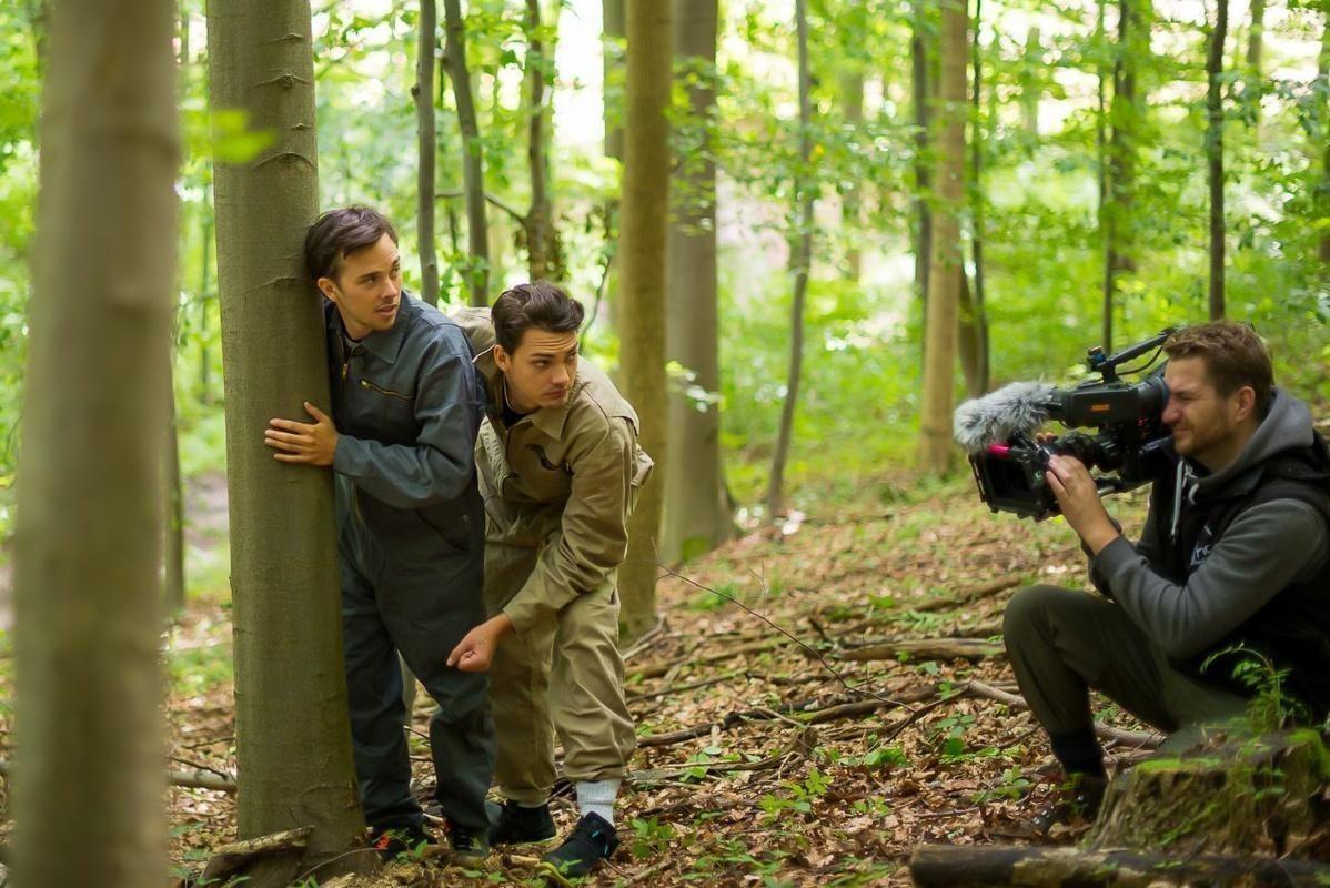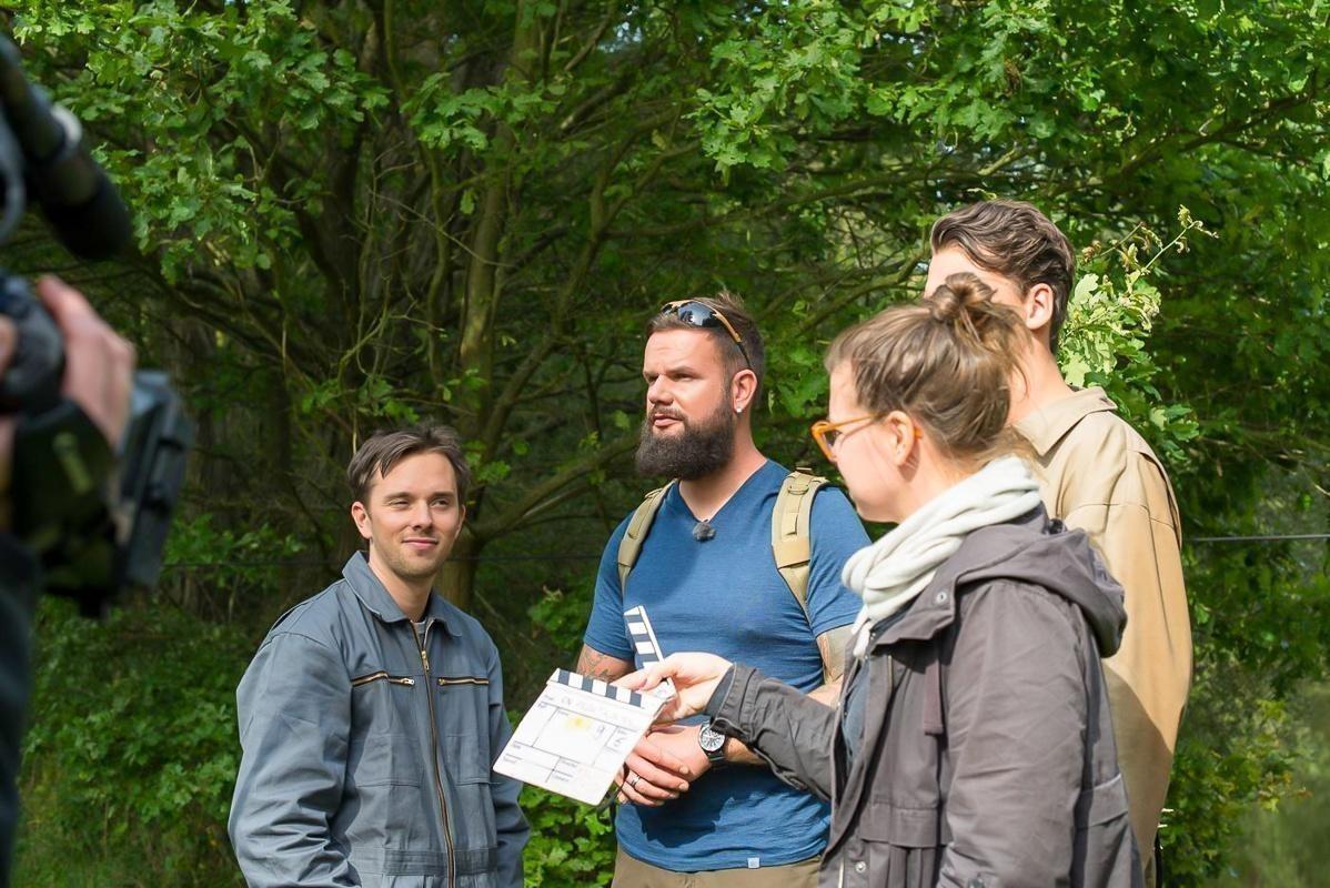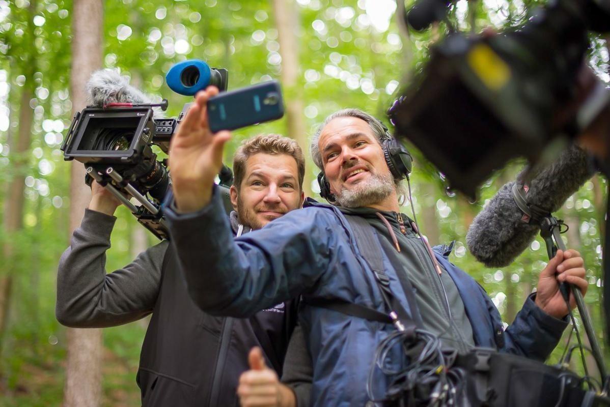 Drei Personen stehen im Wald, während ein Kamerateam Aufnahmen macht