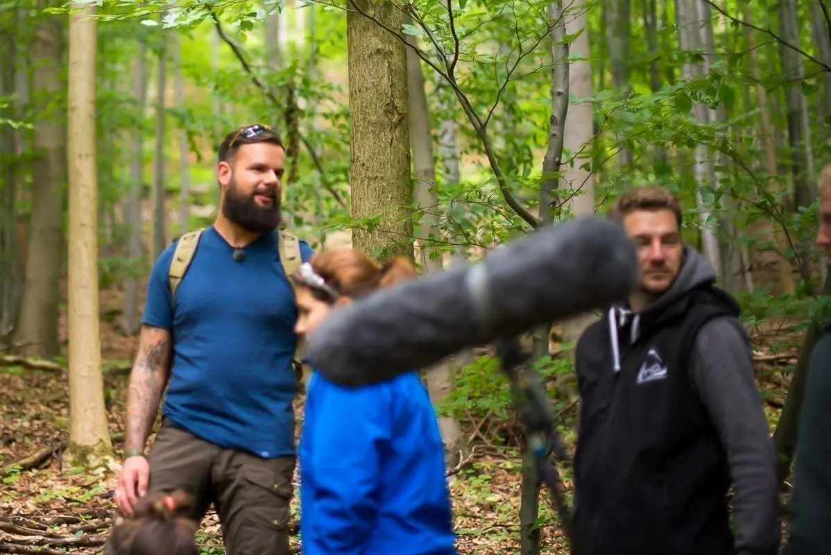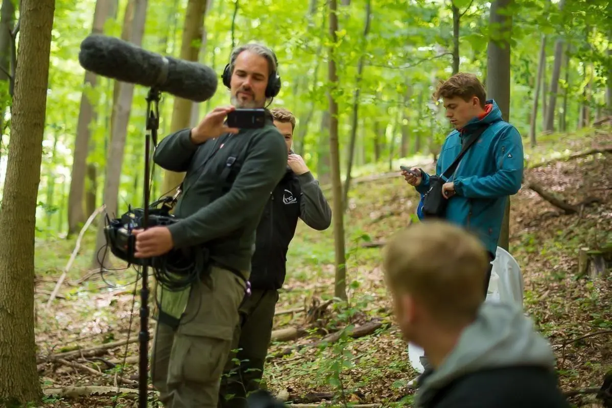 Mikrofon wird von einem Mann im Wald gehalten, während andere sich vorbereiten