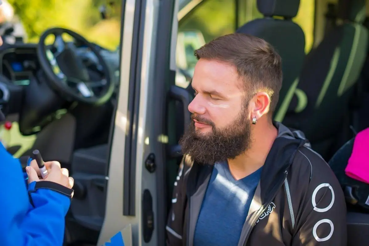 Mann sitzt im Fahrzeug und erhält eine Gesichtsbehandlung