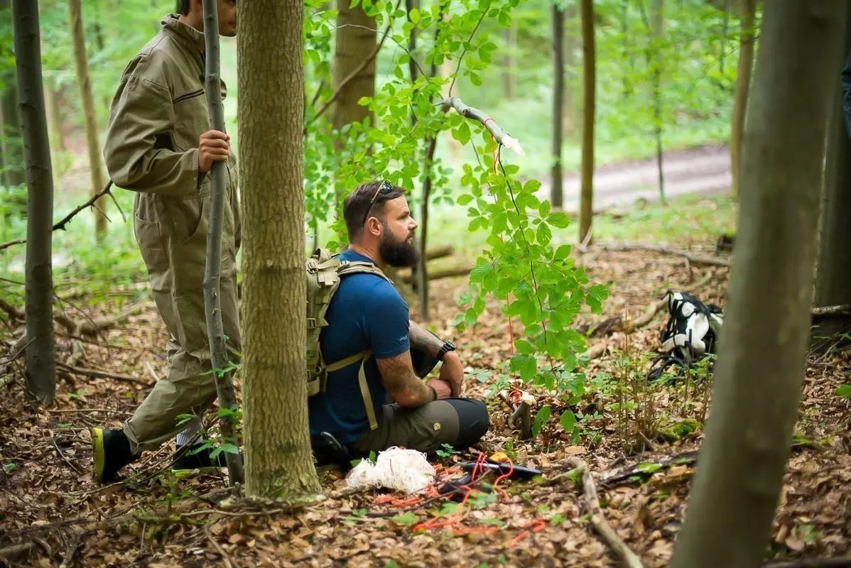 Zwei Personen sitzen im Wald auf dem Boden und betrachten Ausrüstung
