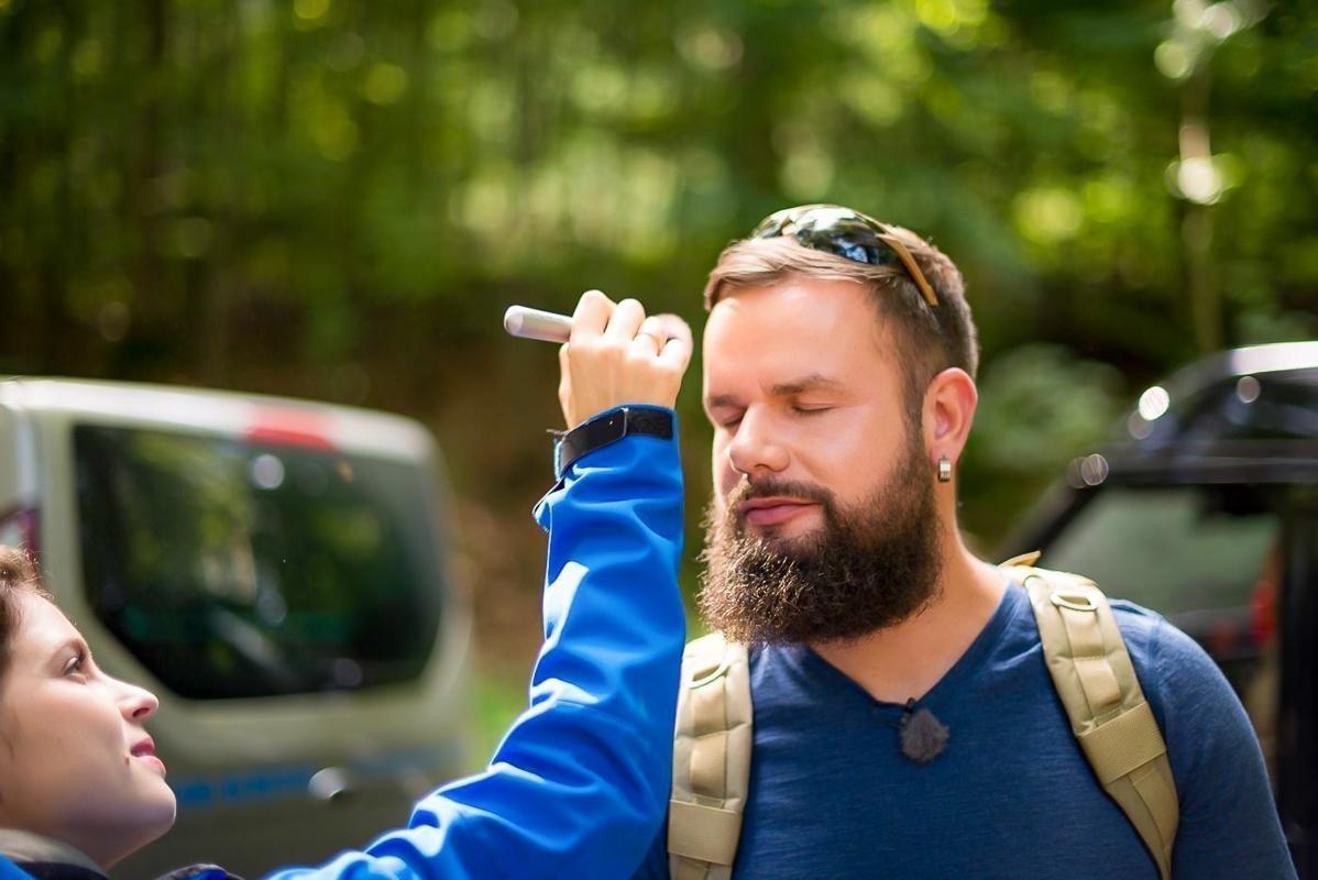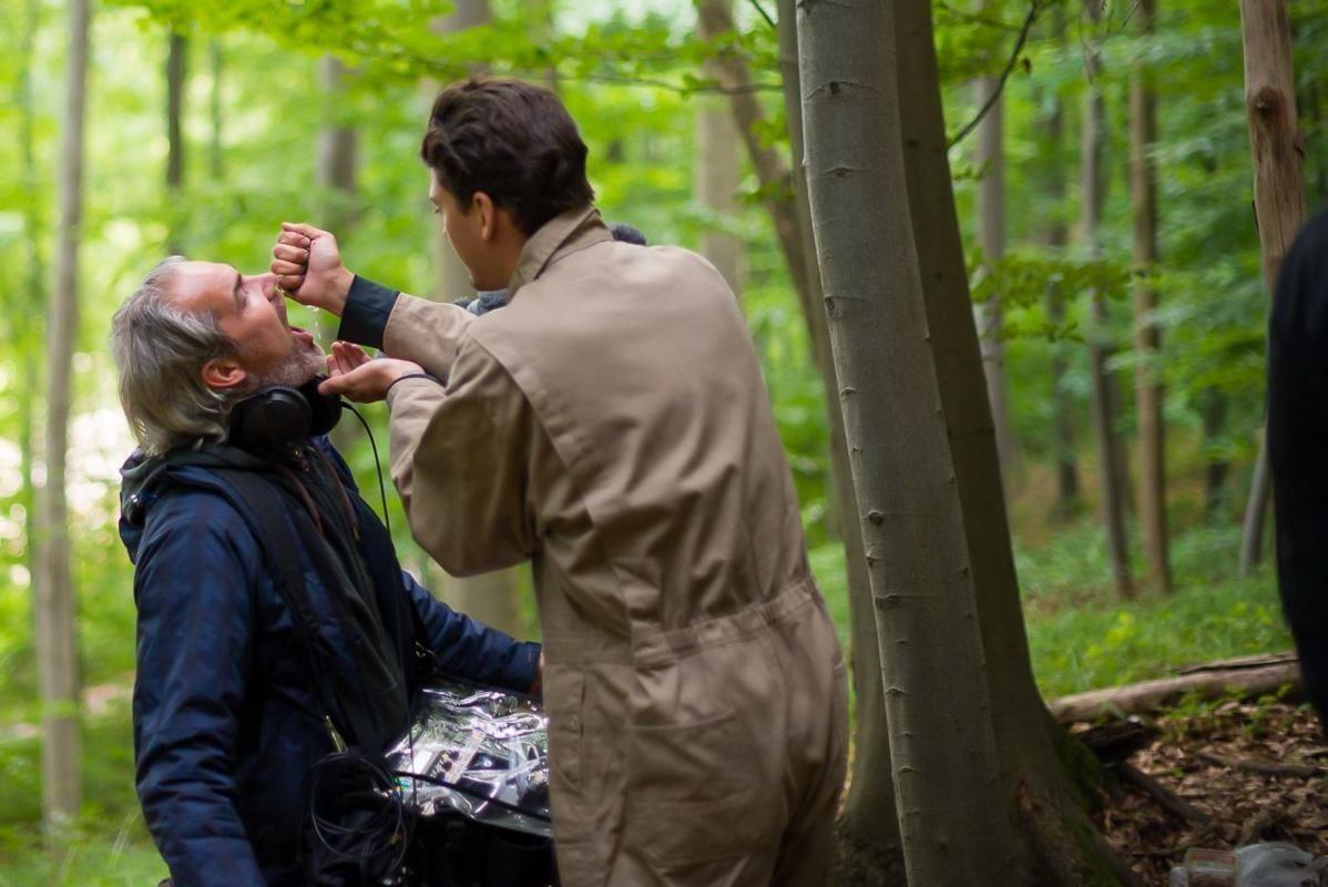 Zwei Personen in einem Wald, eine Person hält etwas vor das Gesicht der anderen