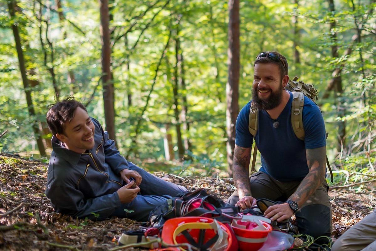 Zwei Personen in Kletterausrüstung stehen in einem Wald, eine Person zeigt Daumen hoch