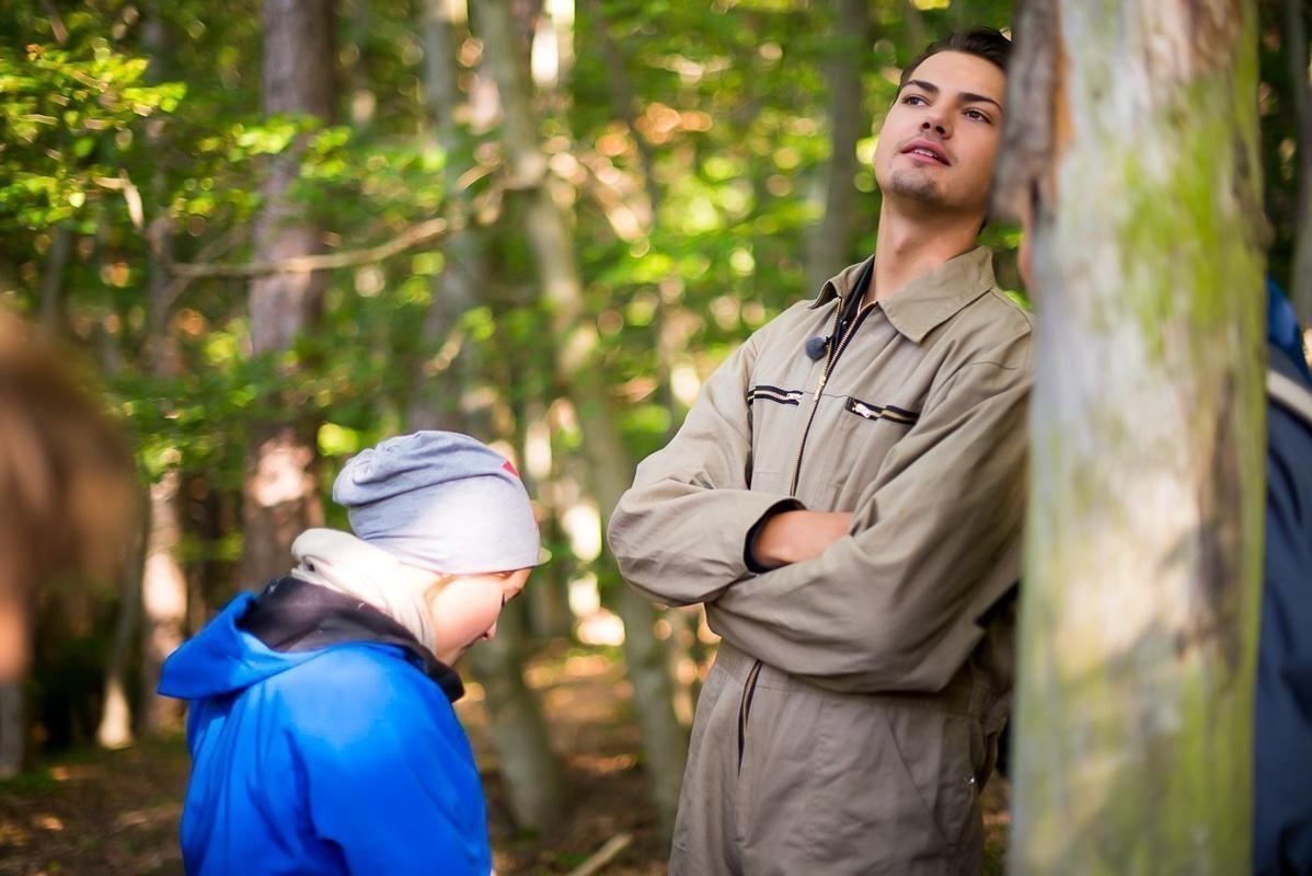 Zwei Personen stehen im Wald, eine lehnt an einem Baum, die andere schaut nach unten