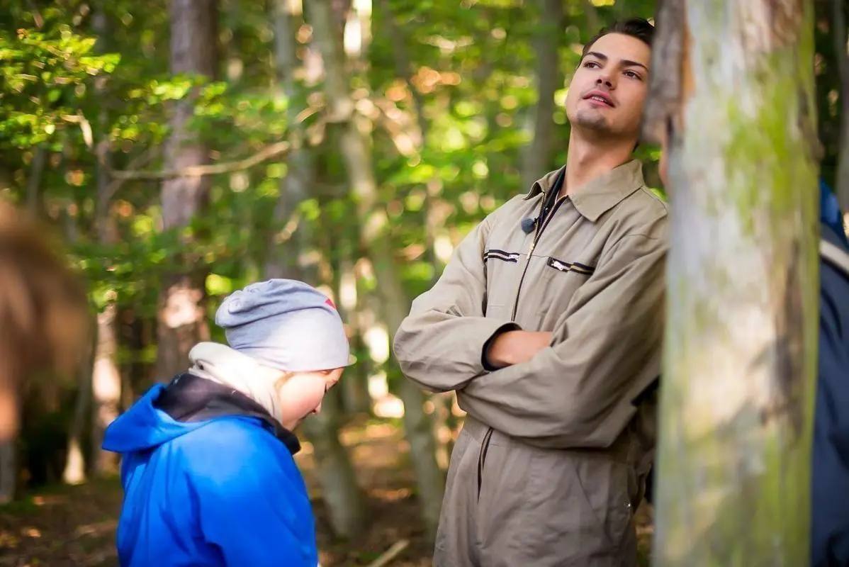 Gruppendynamik im Wald mit Mikrofon und Teilnehmern in Outdoor-Bekleidung