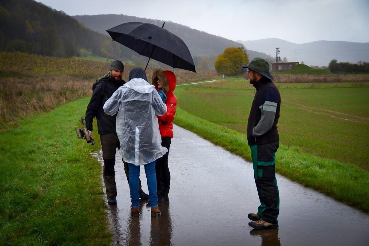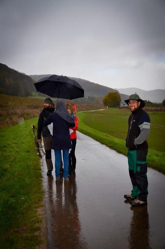 Gruppe steht auf einem nassen Weg, eine Person hält einen Regenschirm