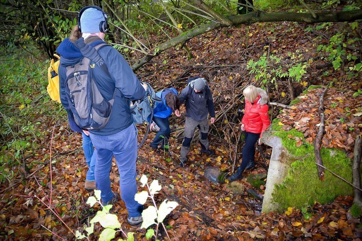Gruppe untersucht einen kleinen Wasserlauf in einem bewaldeten Gebiet