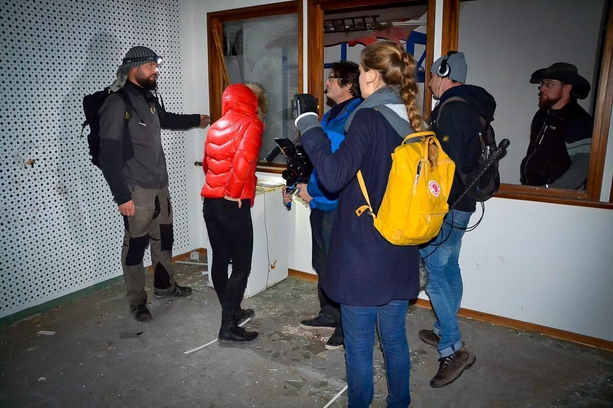 Drei Personen untersuchen Pflanzen in einer verlassenen Umgebung mit einem Mikrofon und Kamera