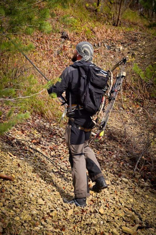 Jäger trägt einen Bogen auf dem Rücken und schaut in den Wald