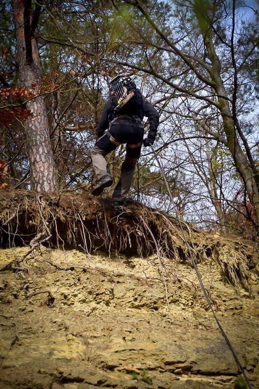 Kletterer mit Rucksack und Seil erklimmt steilen Hang in bewaldeter Umgebung