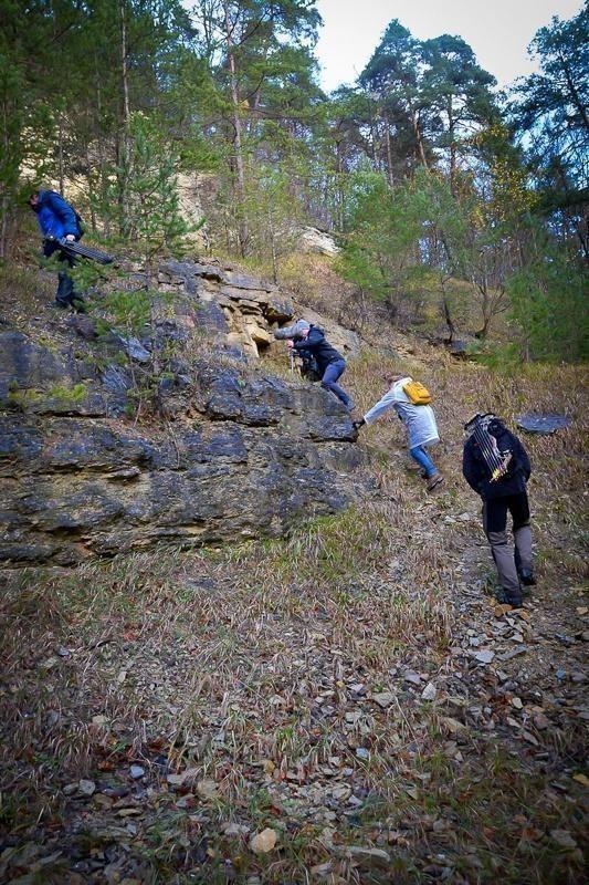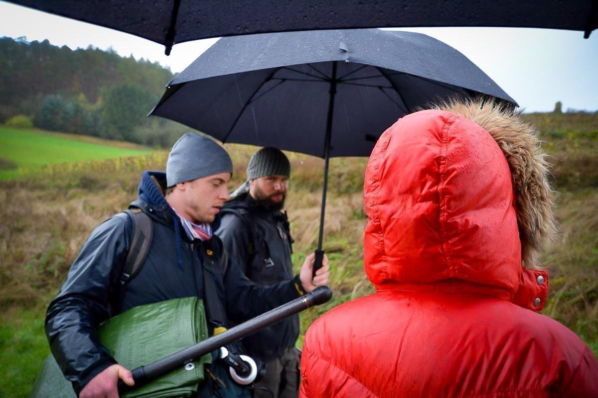 Drei Personen stehen an einem steinigen Hang, einer filmt mit einer Kamera