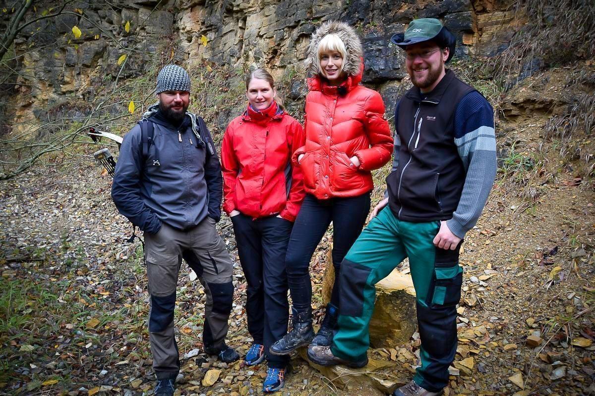 Vier Personen stehen vor einer Felswand in einem Waldgebiet